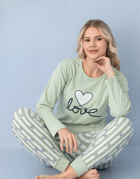 Подарете си топлина и комфорт с тази очарователна дамска пижама, изработена от плътна и мека памучна (интерлог)  материя, идеална за зимния сезон. Горнището е с дълъг ръкав и щампа. Долнището е дълъг панталон с маншети.