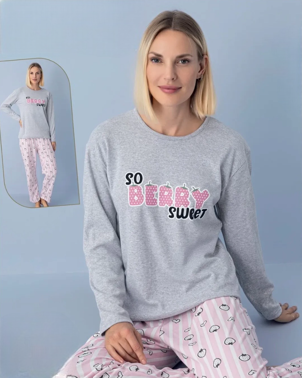 Подарете си топлина и комфорт с тази очарователна дамска пижама, изработена от плътна и мека памучна материя (интерлог), идеална за зимния сезон. Горнището е с дълъг ръкав и щампа. Долнището е дълъг панталон без маншет.