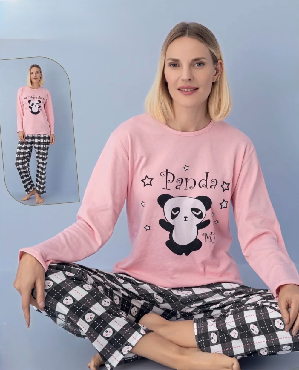 Подарете си топлина и комфорт с тази очарователна дамска пижама, изработена от плътна и мека памучна материя (интерлог), идеална за зимния сезон. Горнището е с дълъг ръкав и щампа. Долнището е дълъг панталон без маншет.