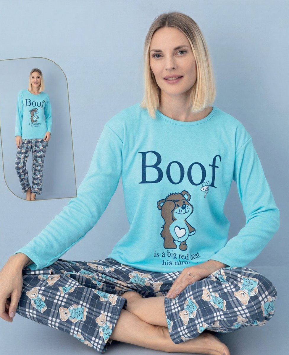 Подарете си топлина и комфорт с тази очарователна дамска пижама, изработена от плътна и мека памучна материя (интерлог), идеална за зимния сезон. Горнището е с дълъг ръкав и щампа. Долнището е дълъг панталон без маншет.