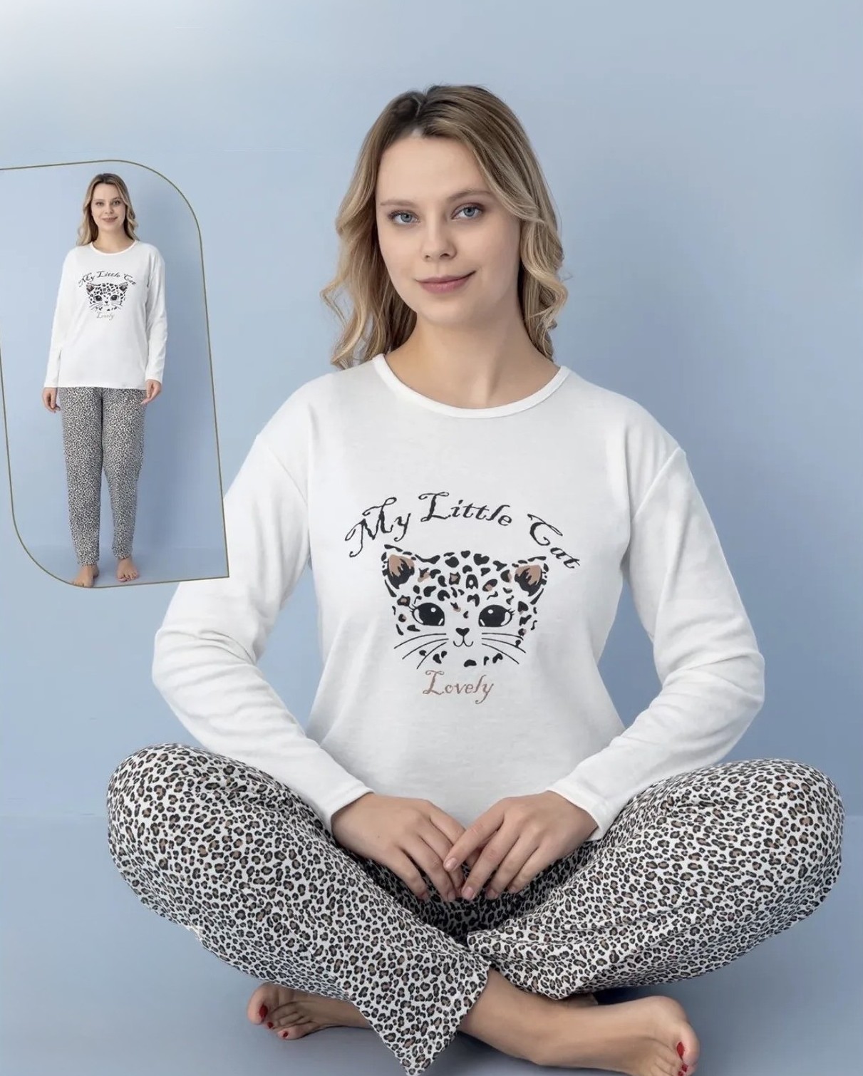Подарете си топлина и комфорт с тази очарователна дамска пижама, изработена от плътна и мека памучна материя (интерлог), идеална за зимния сезон. Горнището е с дълъг ръкав и щампа. Долнището е дълъг панталон без маншет.