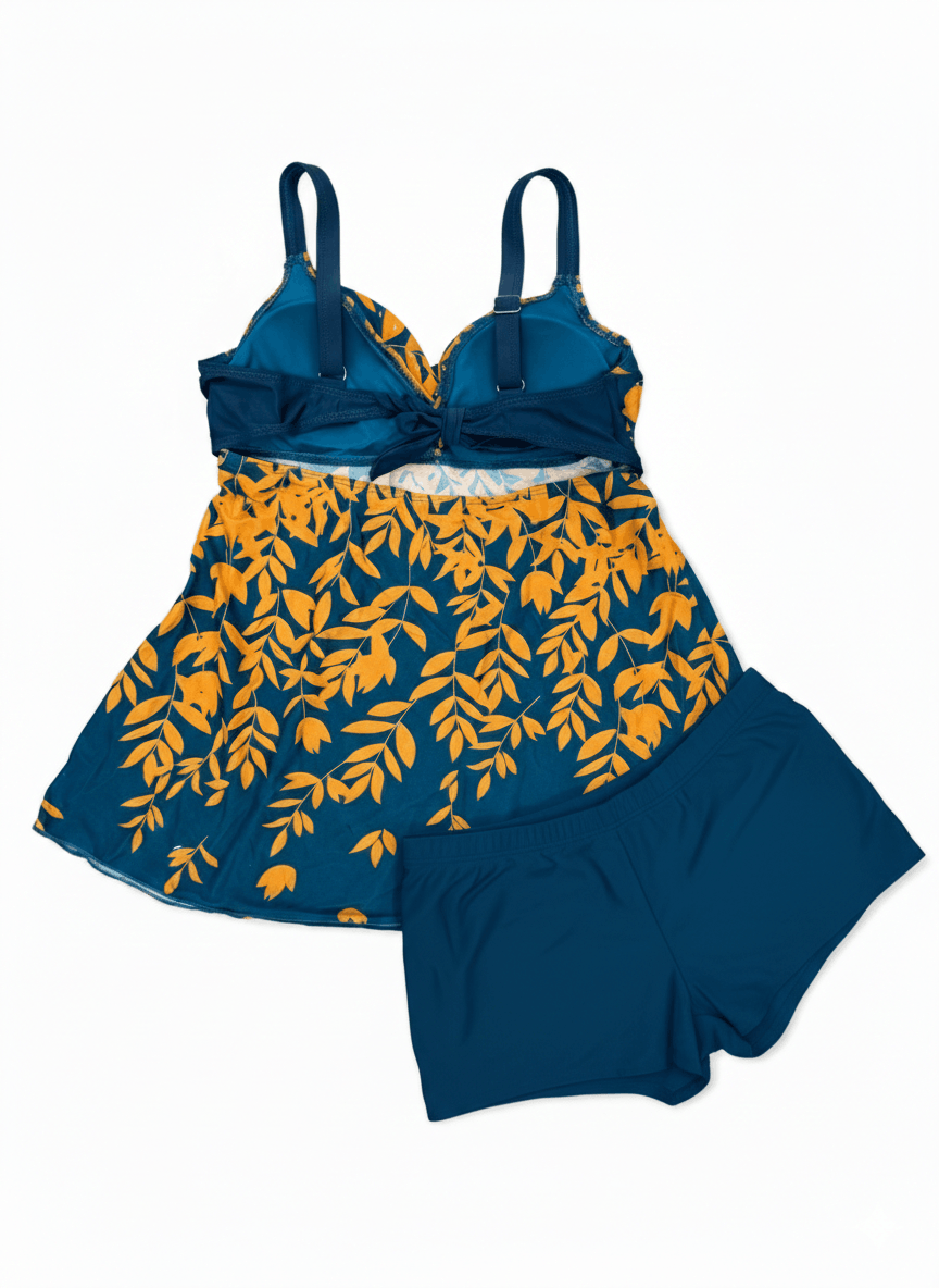 Открийте перфектния баланс между елегантност и удобство с този дамски бански танкини. Моделът съчетава модерна визия и практичен дизайн, подходящ както за плаж, така и за басейн. Горнището е с меки чашки без банели, с подвижни подплънки, завързване на гърба, регулиращи се презрамки. Украсено с блестящи камъчета по чашките. Долнището е тип боксер. Свободно падащата кройка прикрива коремната област и създава усещане за лекота и комфорт. Идеално решение за дами, които търсят повече покритие и удобство без компромис със стила.