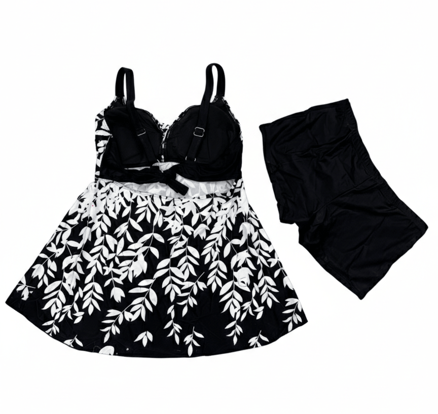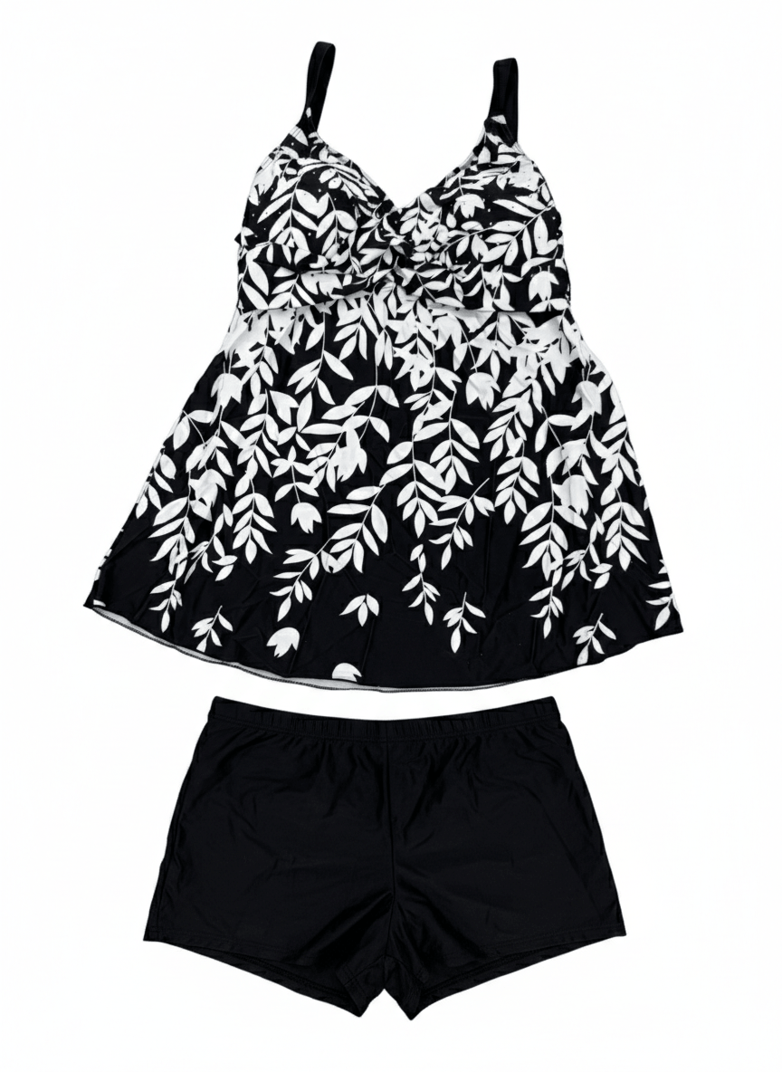 Открийте перфектния баланс между елегантност и удобство с този дамски бански танкини. Моделът съчетава модерна визия и практичен дизайн, подходящ както за плаж, така и за басейн. Горнището е с меки чашки без банели, с подвижни подплънки, завързване на гърба, регулиращи се презрамки. Украсено с блестящи камъчета по чашките. Долнището е тип боксер. Свободно падащата кройка прикрива коремната област и създава усещане за лекота и комфорт. Идеално решение за дами, които търсят повече покритие и удобство без компромис със стила.