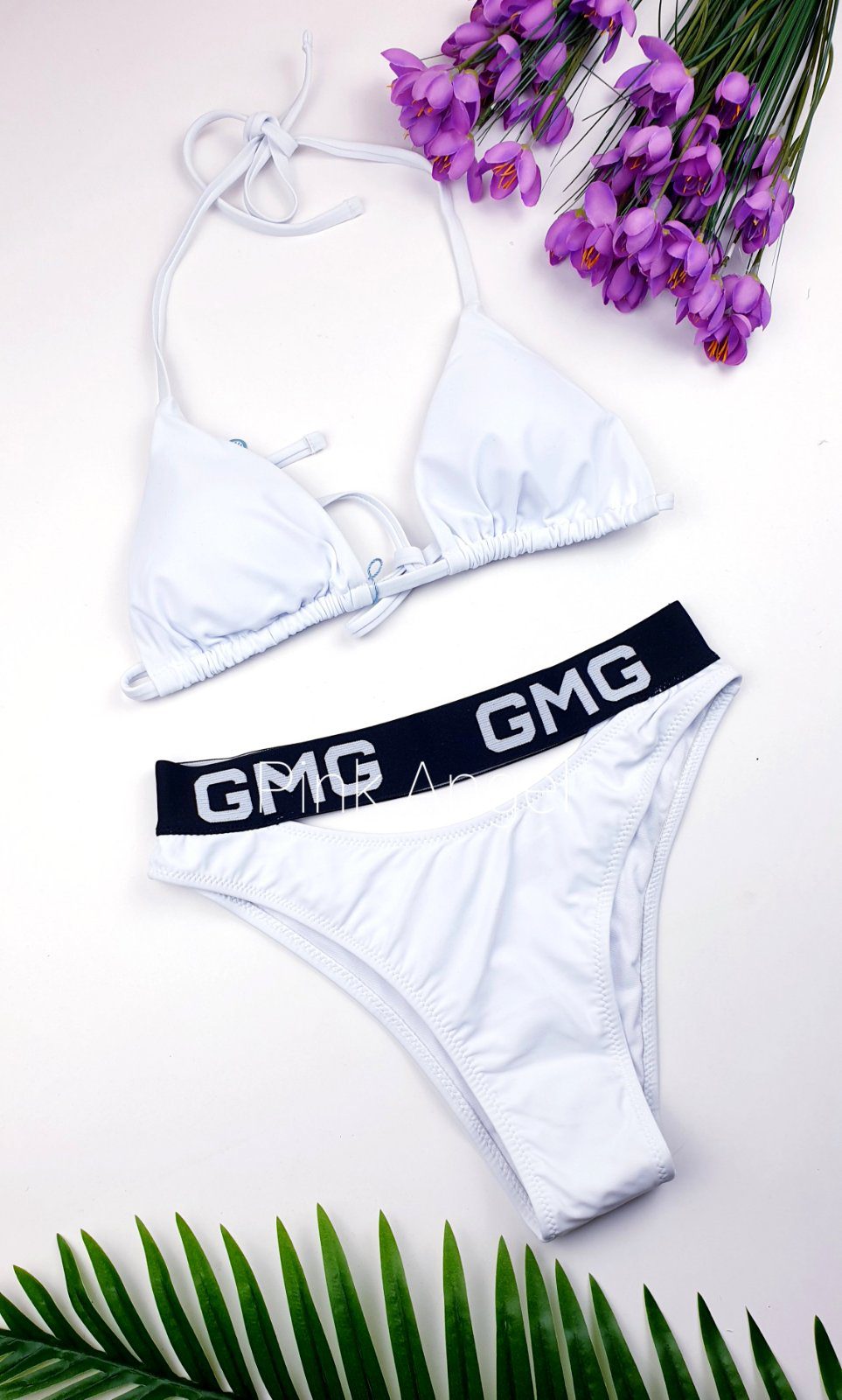 Дамски бански от три части . Горнището е с меки подплънки , които могат да се премахнат, но без банели. С връзки на гърба и презрамка през врата. Чашка В. Долнището е бразилка с висока талия и ефектен колан. Третата част е тюлена тениска с дълъг ръкав.