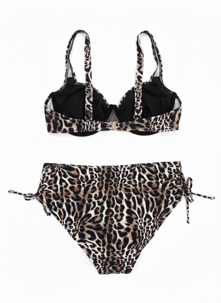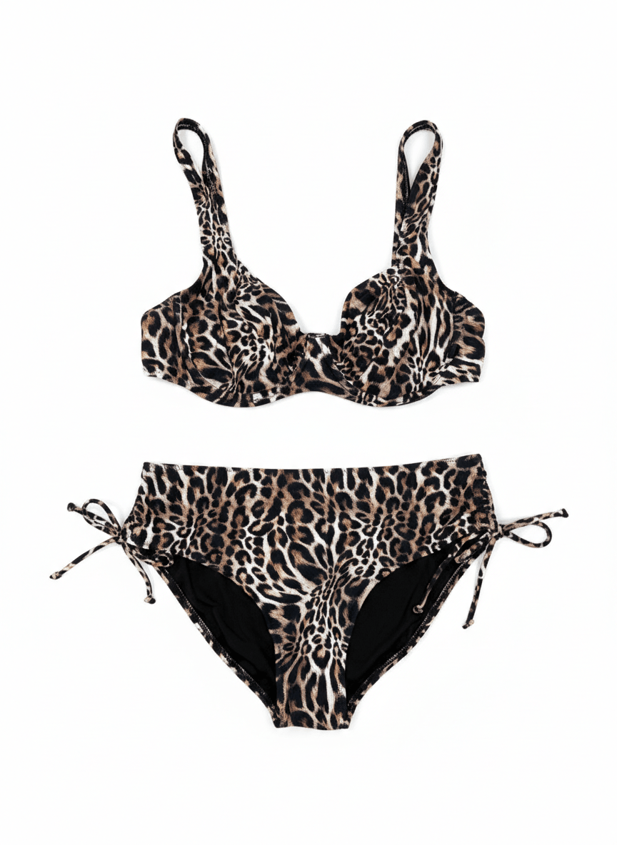 Дамски бански от две части. Стилен и удобен дамски бански комплект. Горнището е с меки чашки без подплънки, с банели, регулиращи се презрамки и задно закопчаване. Перфектен избор за жени, които търсят удобен бански с добра опора и изискан дизайн. Долнището е бикина с връзки за регулиране. Moделът е подходящ за дами с по-голем бюст.