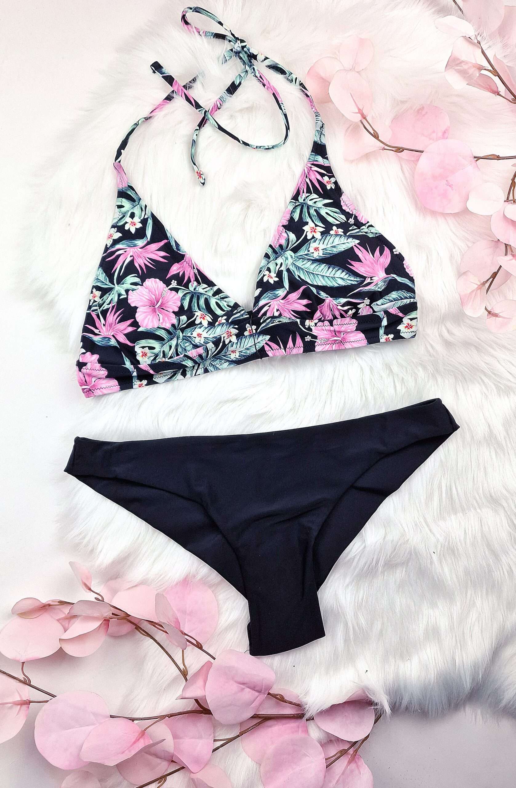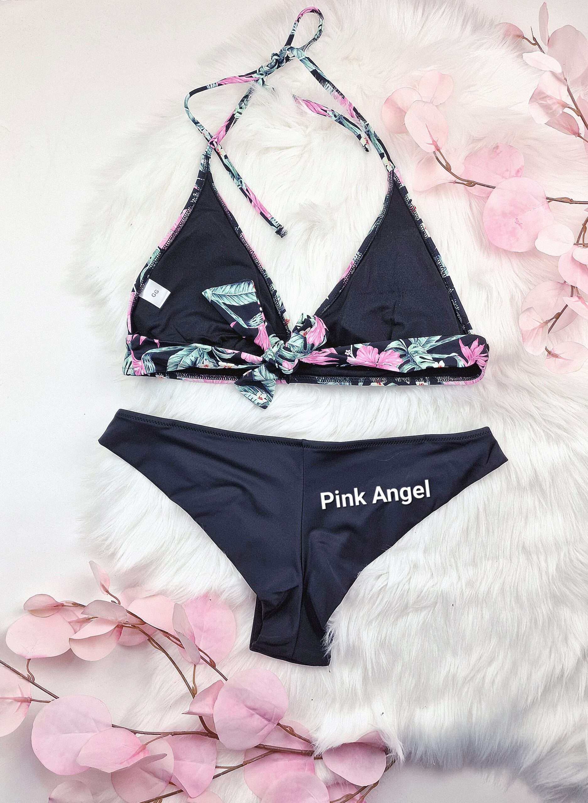 Дамски бански от две части със задно и на врата завръзване. Горнището е с мека, триъгълна чашка, с подвижна подплънка и без банели. Чашка В. Долнището е бразилка.