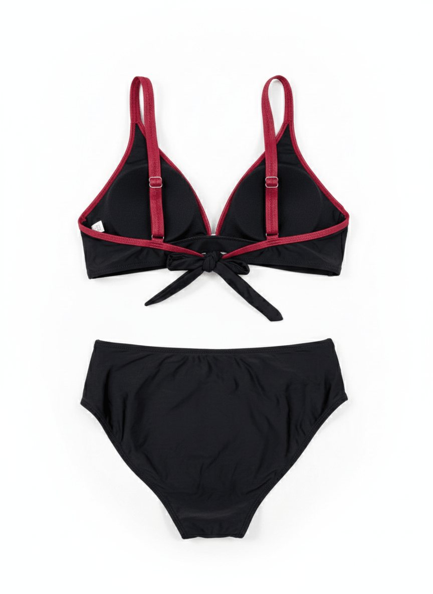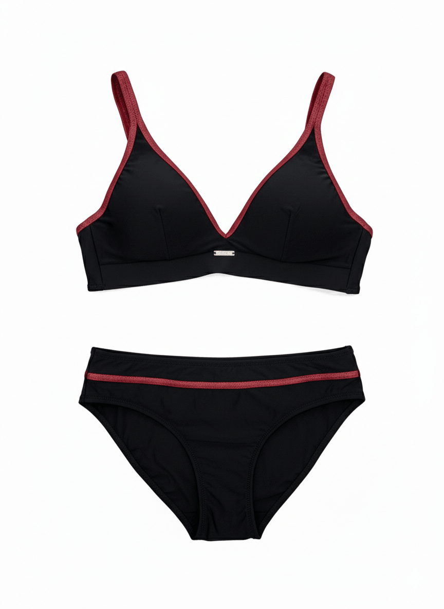 Дамски бански от две части. Стилен и удобен дамски бански комплект. Моделът е създаден за комфорт и перфектно прилягане, като подчертава естествените извивки на тялото. Брокатени кантовете. Горнището е без банели с меки чашки, с подвижни подплънки, регулеруеми презрамки, завързване на гърба, дълбоко V-образно деколте. Долнището е класическа бикина. Перфектен избор за жени, които търсят съчетание от комфорт, функционалност и модерен дизайн.