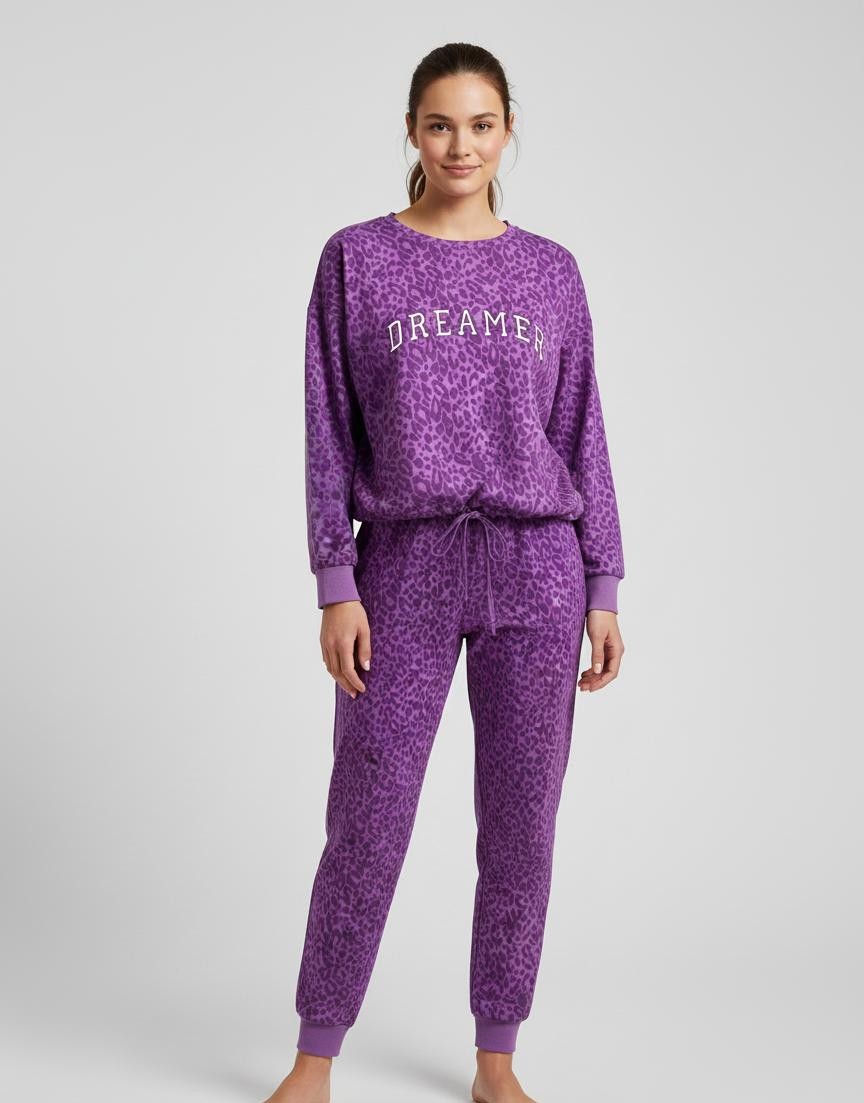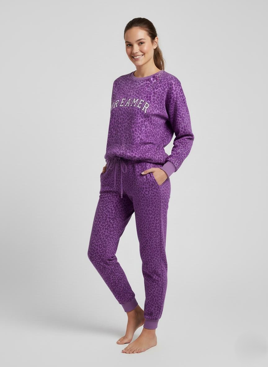 Открийте перфектното съчетание между удобство и стил с нашия очарователен дамски комплект пижама. Горнището е с дълъг ръкав, свободна кройка и обло деколте. Долнището е с дълъг панталон с еластичен колан и маншети на крачолите.