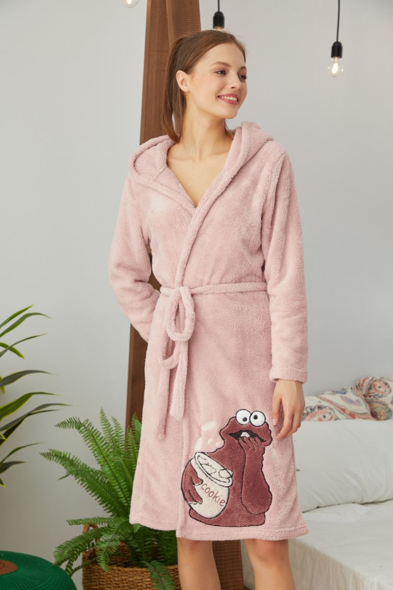 Домашен дамски халат с качулка и апликация мъпет .