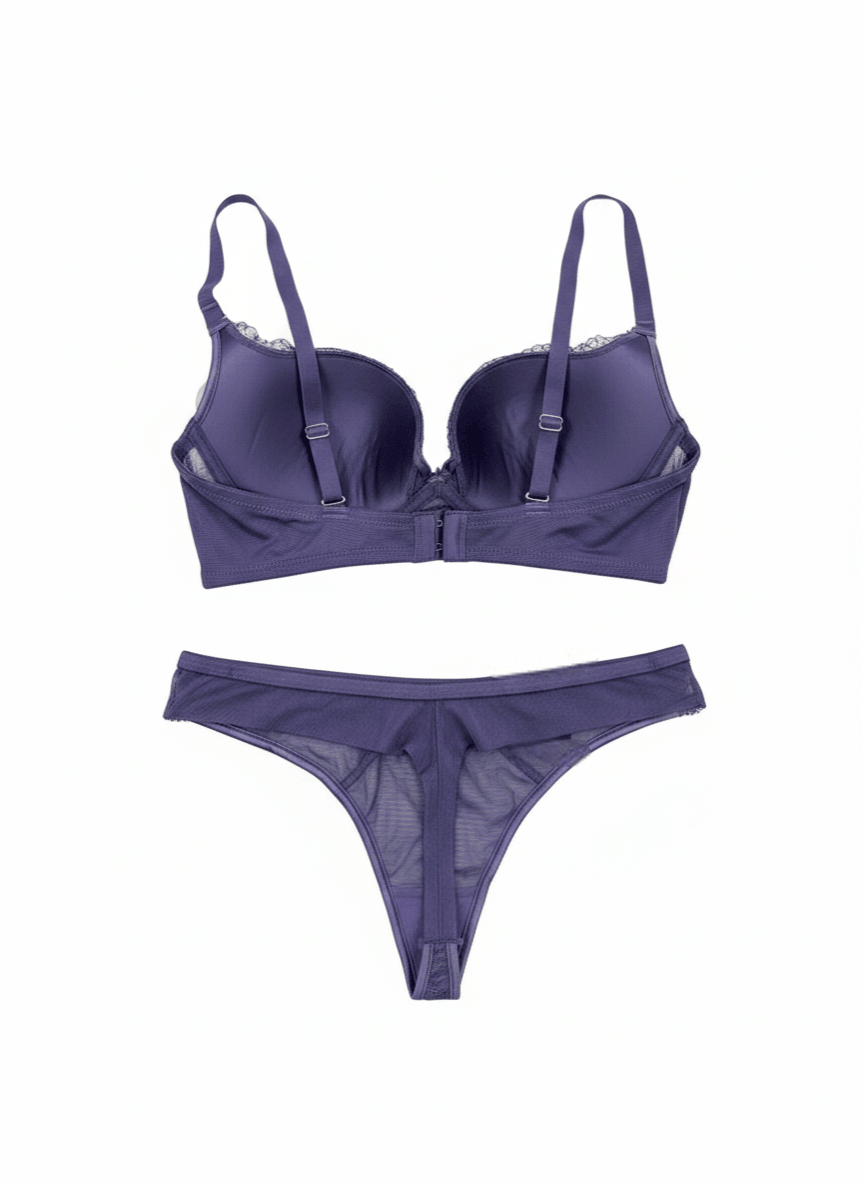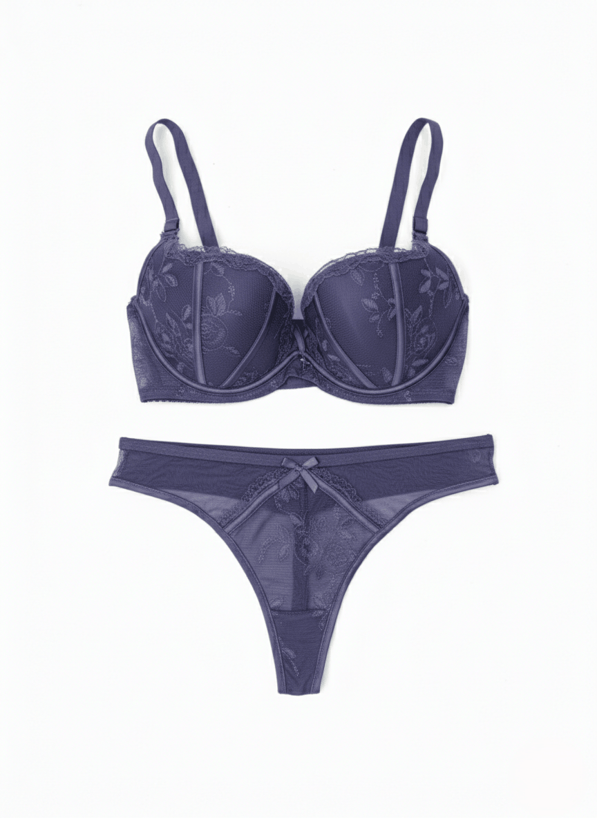 Открий изяществото и комфорта с този стилен дантелен комплект дамско бельо, включващ сутиен с банели, с твърди чашки и подплънки. Дантелени прашки. Моделът съчетава фина флорална дантела, прозрачни мрежести детайли и елегантен дизайн, който подчертава женствените извивки. Деликатната дантела придава луксозно излъчване, а регулируемите презрамки осигуряват перфектно прилягане.