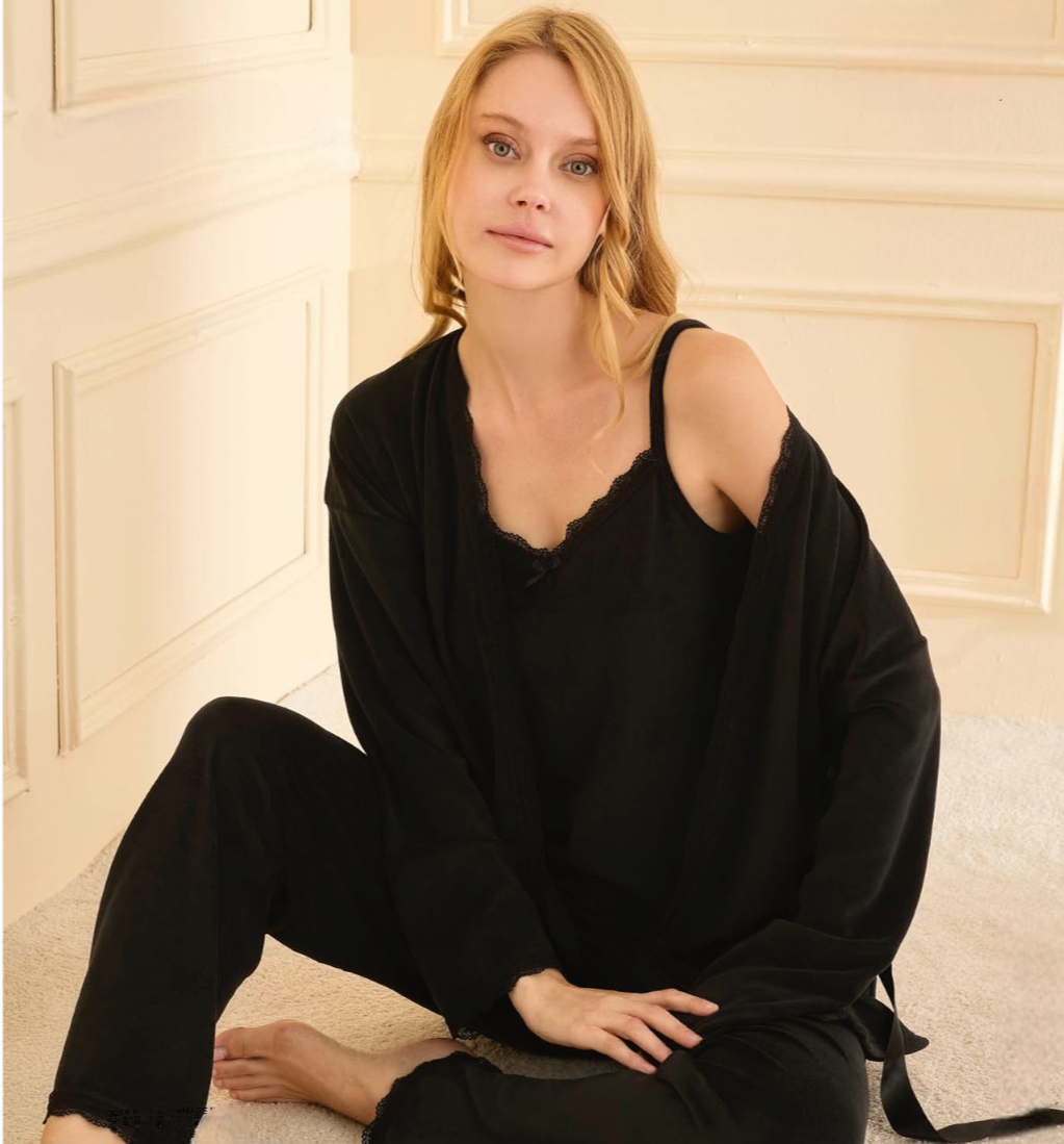 Потопи се в мекотата и лукса на тази стилна дамска пижама от 3 части, изработена от висококачествено кадифе. Моделът съчетава практичност и изисканост, за да се чувстваш еднакво удобно и красиво у дома.