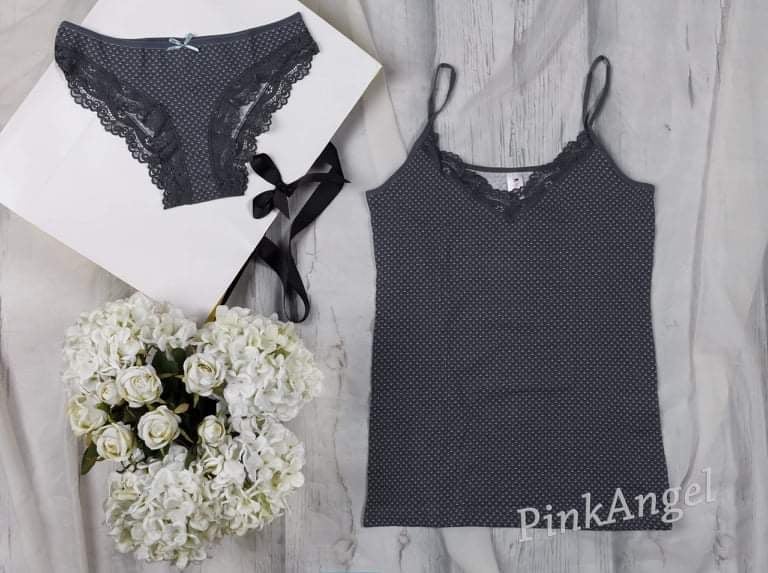 Елегантен дамски комплект бельо PinkAngel – изработен от висококачествена мека материя с фина дантела. Комплектът включва нежен сив потник с тънки презрамки и удобни бикини в същия цвят и дизайн. Подходящ за ежедневието или специални поводи, този комплект съчетава комфорт, стил и изтънченост. Добави нотка женственост и увереност в гардероба си с PinkAngel!