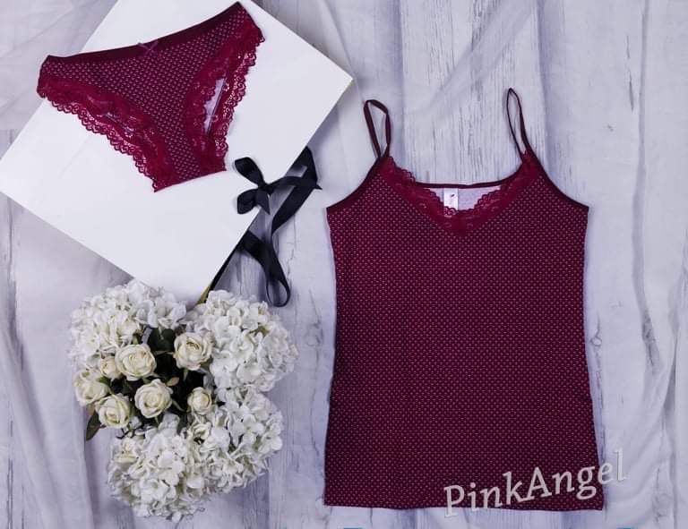 Елегантен дамски комплект бельо PinkAngel – изработен от висококачествена мека материя с фина дантела. Комплектът включва нежна бордо потниче с тънки презрамки и удобни бикини в същия цвят и дизайн. Подходящ за ежедневието или специални поводи, този комплект съчетава комфорт, стил и изтънченост. Добави нотка женственост и увереност в гардероба си с PinkAngel!
