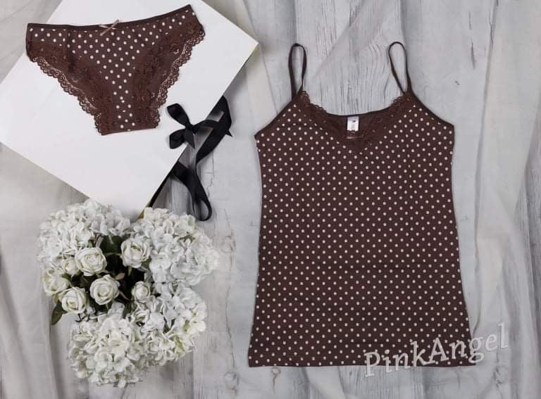 Елегантен дамски комплект бельо PinkAngel – изработен от висококачествена мека материя с фина дантела. Комплектът включва нежно кафяв потник с тънки презрамки и удобни бикини в същия цвят и дизайн. Подходящ за ежедневието или специални поводи, този комплект съчетава комфорт, стил и изтънченост. Добави нотка женственост и увереност в гардероба си с PinkAngel!