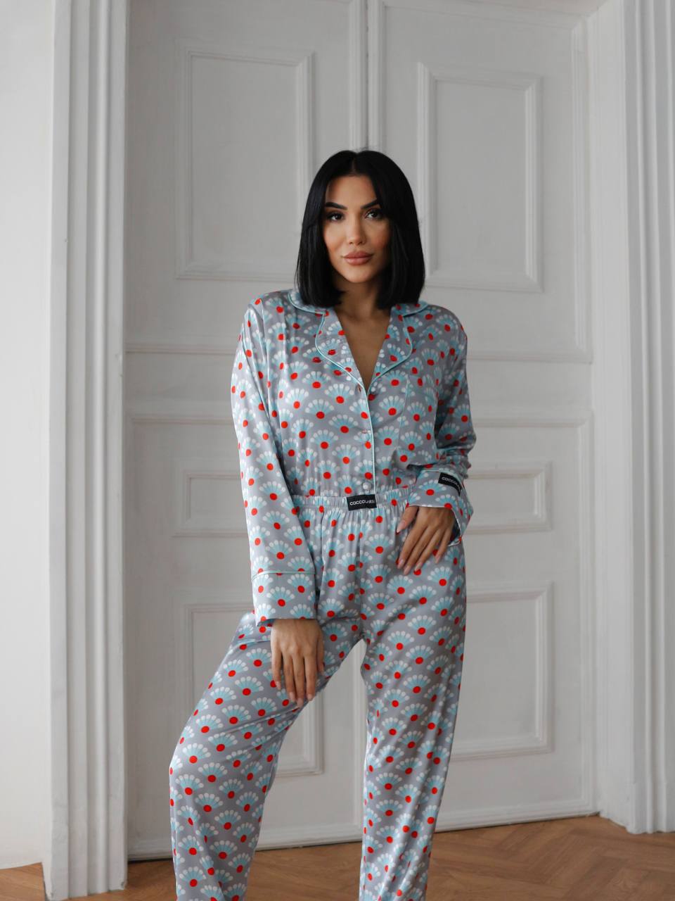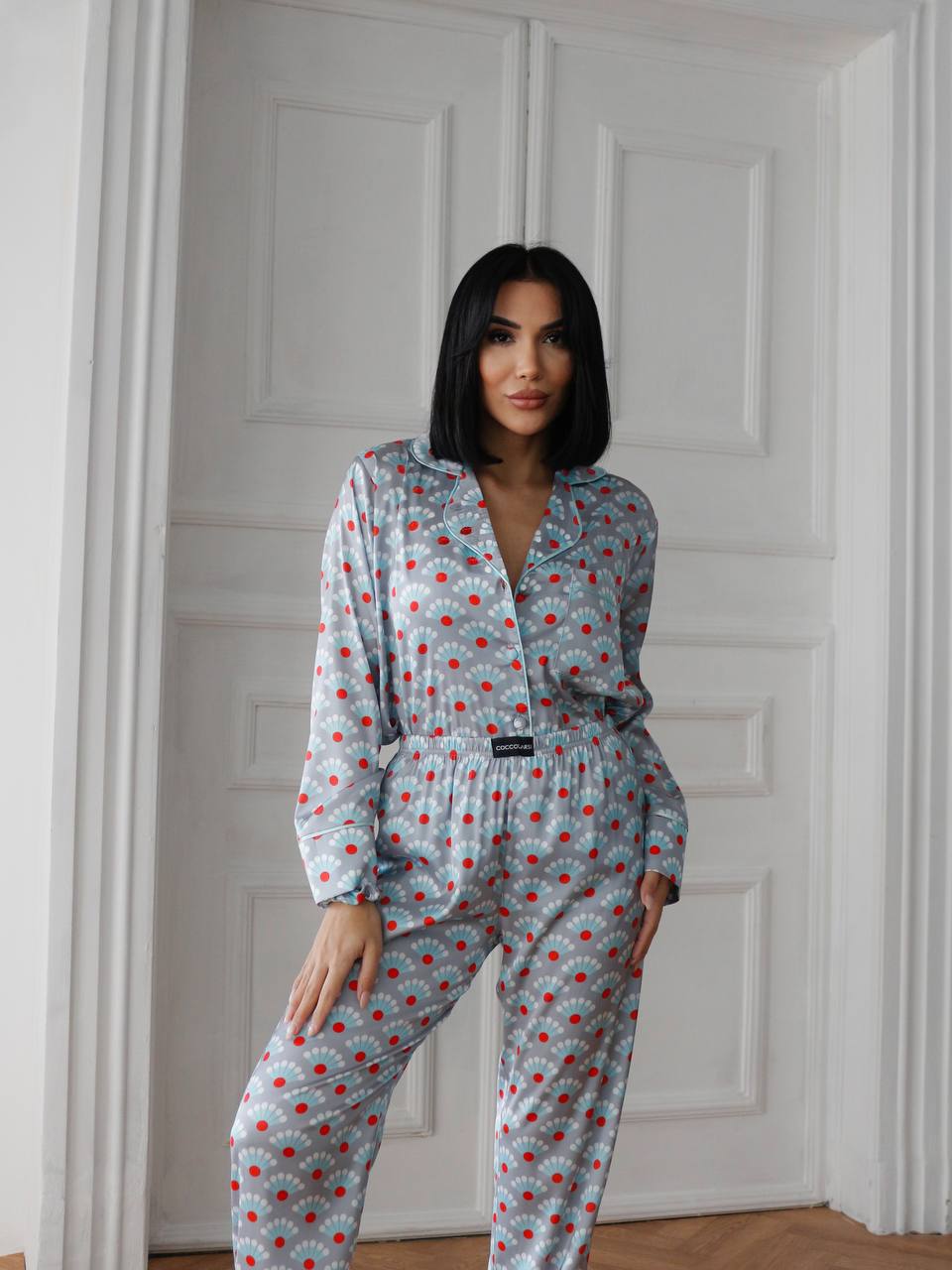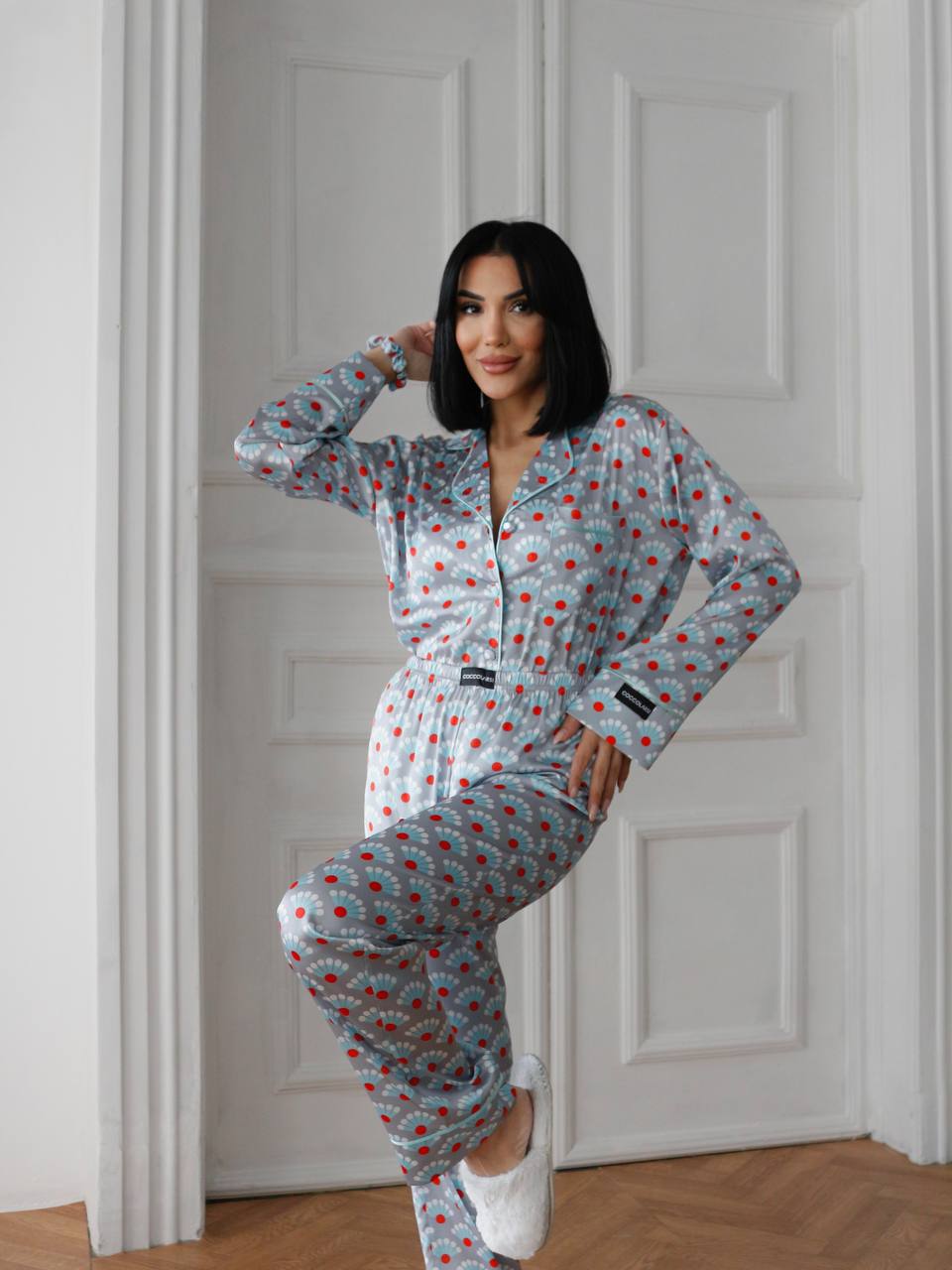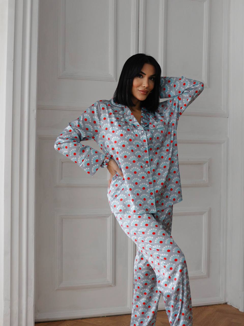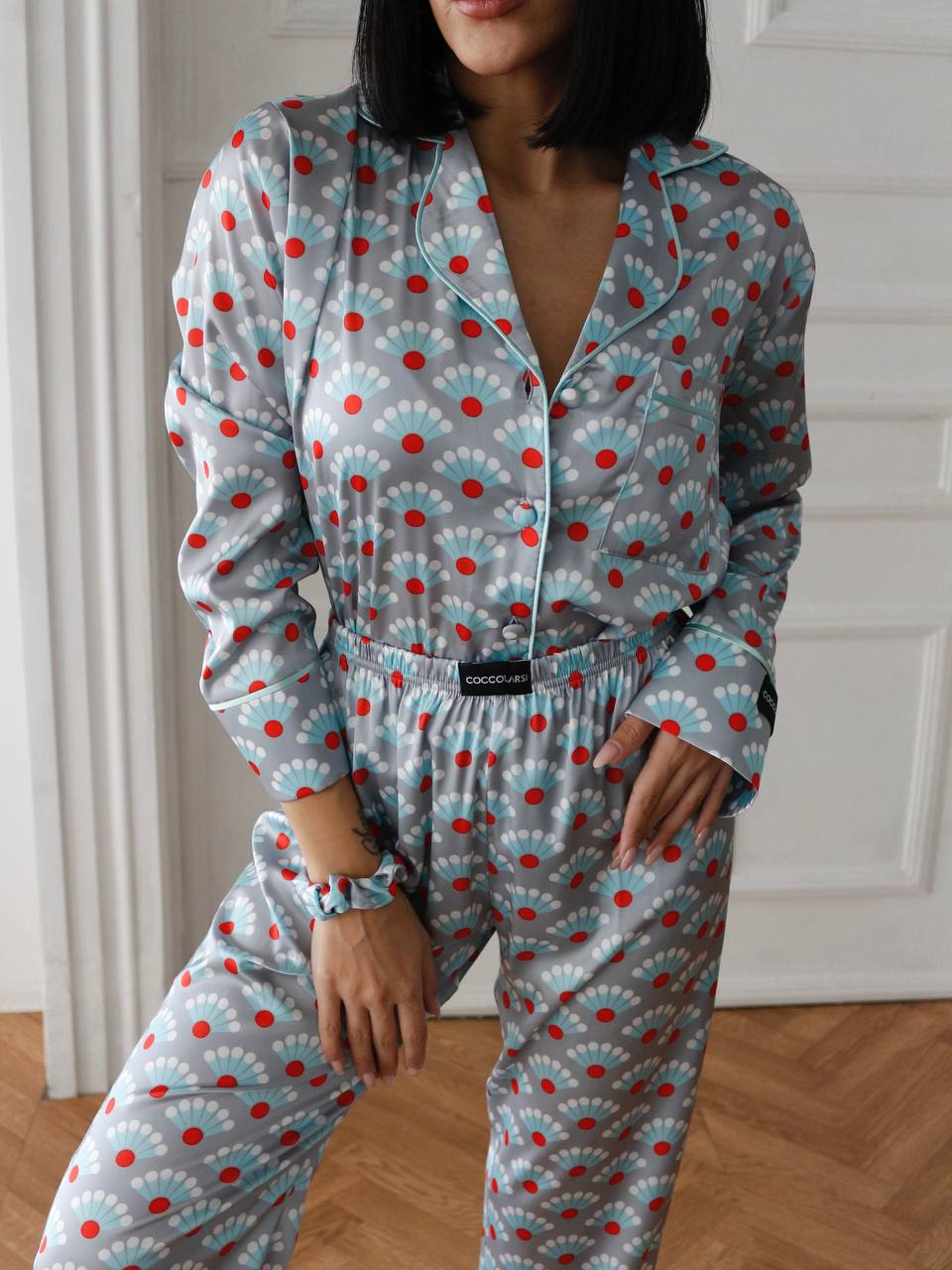 Луксозна дамска сатенена пижама с подарък-скрънчи за коса. Изработена от мек и гладък сатен. Горнището е с дълъг ръкав, копчета по цялата дължина и джобче отпред. Долнището е дълъг панталон с еластичен колан.