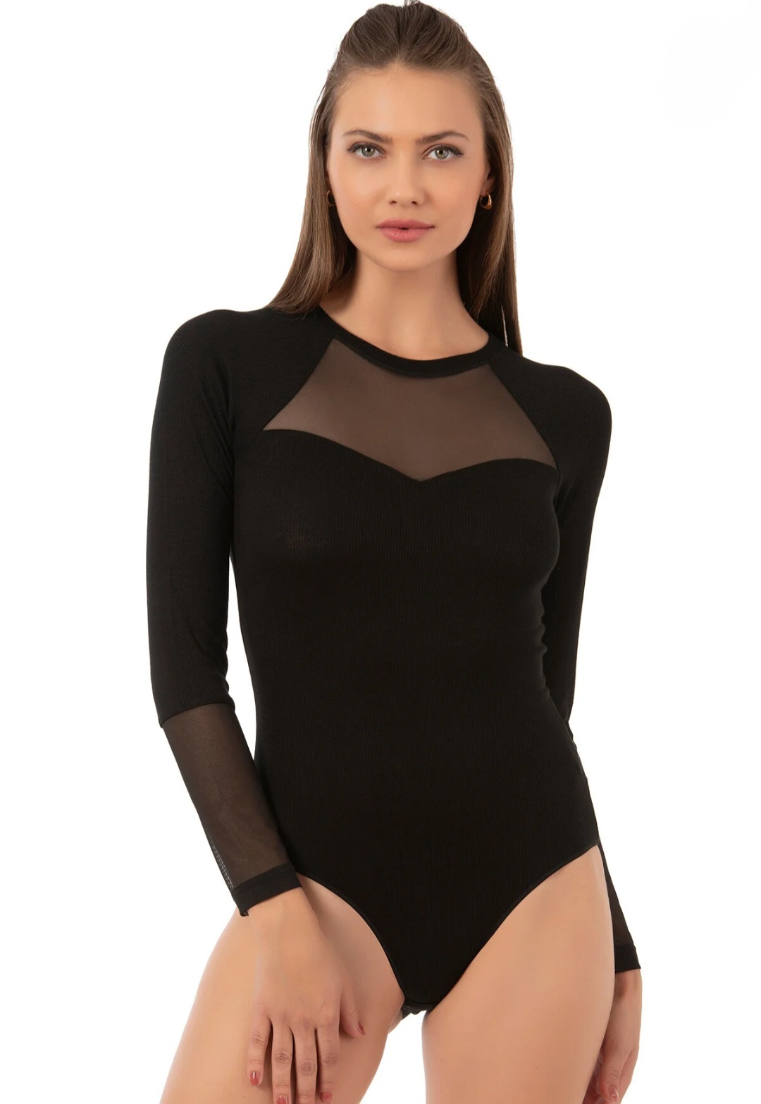 Дамско, елегантно боди с дълъг ръкав, полуполо– бикина. Комбинация от памук и тюл (мрежа).