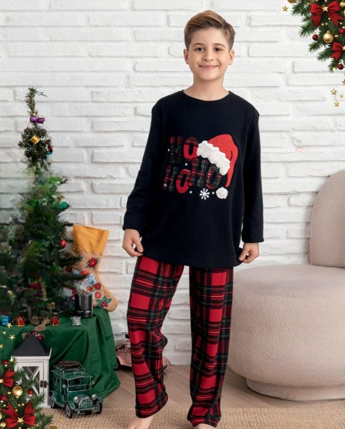 Внесете празнично настроение и стил у дома с този коледен комплект пижама. Горната част е в класическо черно с весела коледена апликация. Долнището е в червено-черно каре – един от най-предпочитаните зимни мотиви, съчетаващ уют и празнична естетика. Меката и удобна материя осигурява топлина и комфорт през студените дни, което прави комплекта идеален за почивка, коледни събирания или семейни фотосесии.