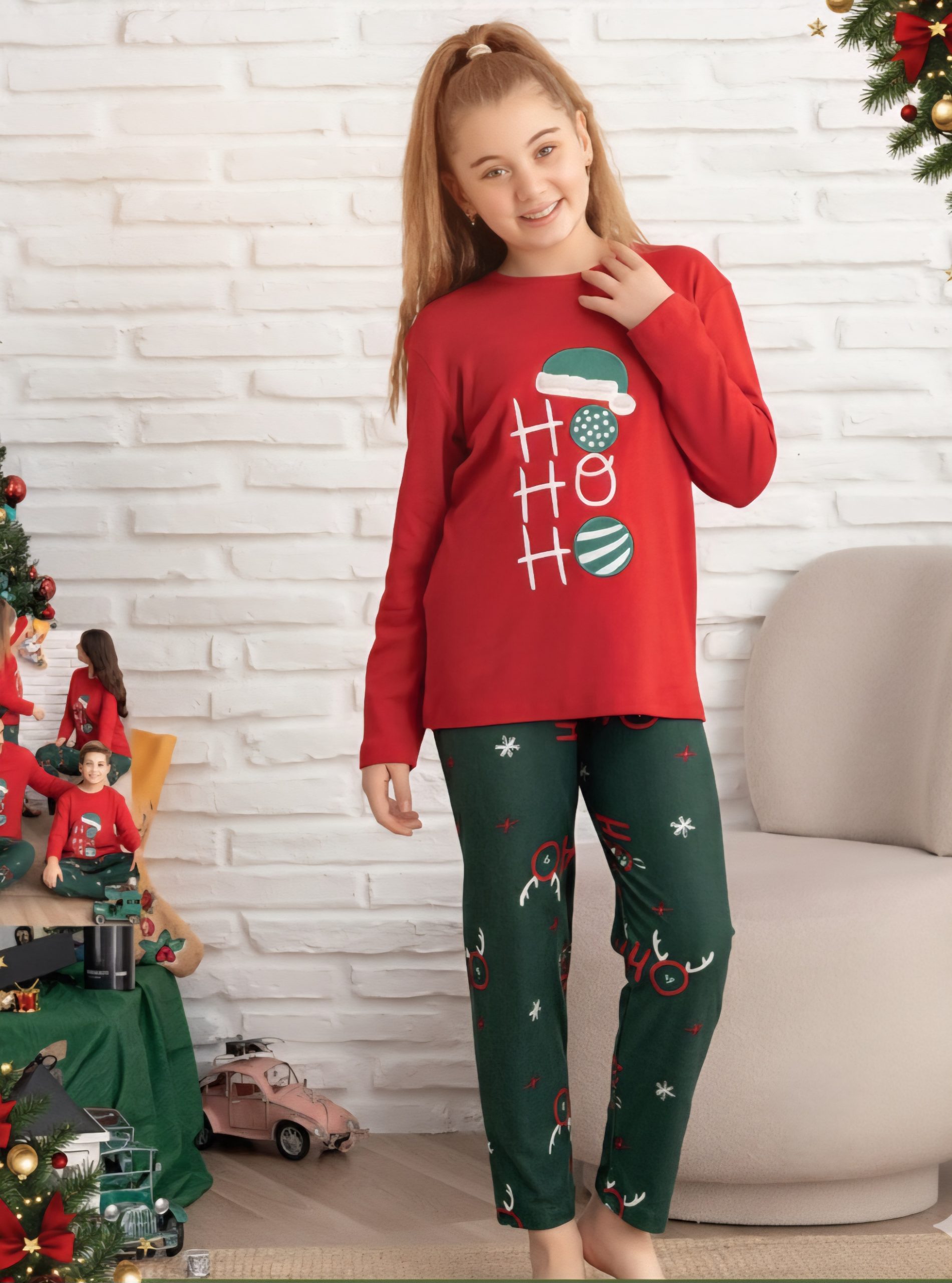 Подарете си уют и празнично настроение с този коледен дамски комплект пижама. Моделът включва мекa и комфортна блуза в зелено с тематичен надпис „Ho Ho Ho“ и коледна шапка, както и удобни дълги панталони в класически червен каре десен. Идеален е както за зимни вечери у дома, така и за семейни коледни снимки. Изработен от висококачествена, дишаща материя, този комплект осигурява топлина и свобода на движение. Перфектен избор за подарък или за допълване на празничната атмосфера.