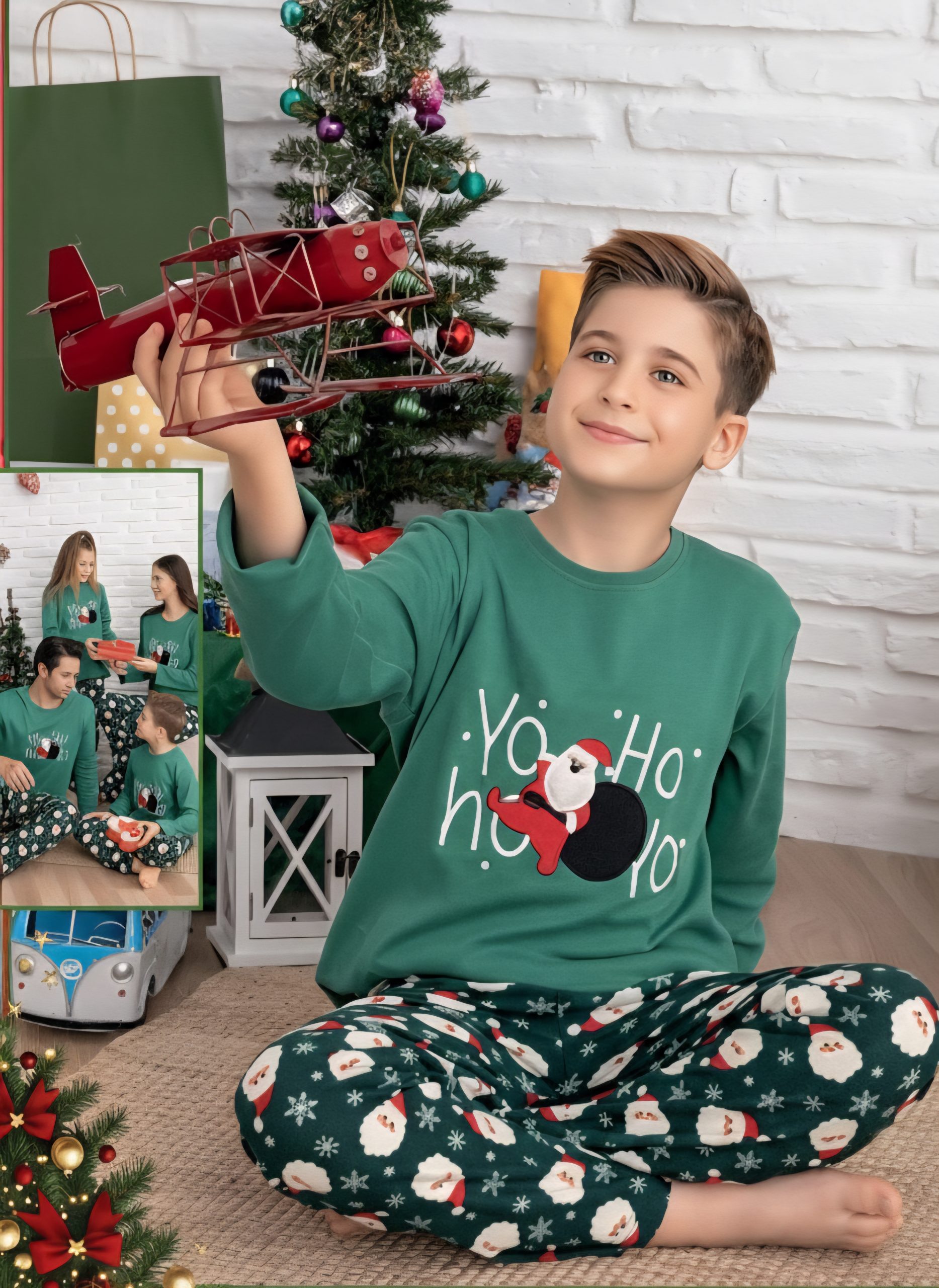 Добавете празничен дух и комфорт към зимните дни с този коледен комплект пижама . Горната част е в наситено зелено с весел надпис „Yo Ho Ho“ и коледна шапка, а долнището е с уникален шарен десен със снежинки и усмихнати Дядо Коледовци. Моделът е създаден от мека, топла и приятна на допир материя, която осигурява пълен комфорт през студените месеци. Подходящ както за уютни вечери у дома, така и за забавни семейни коледни фотосесии.