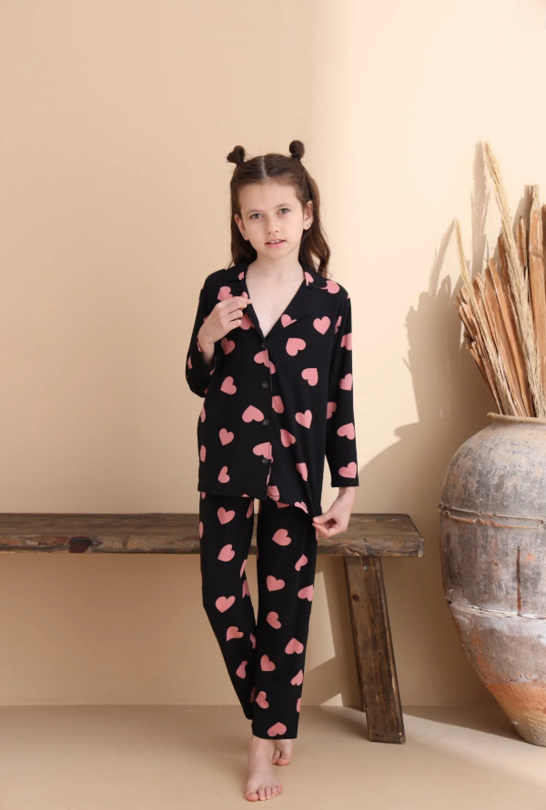 Уютна детска пижама от колекцията „Мама и аз“ .Тези модели са създадени за специални моменти у дома – когато майка и дъщеря могат да се насладят на уют, мекота и стил заедно. Горната част е с класическа кройка – копчета отпред, яка и дълги ръкави, а долната част са удобни панталони с ластик на талията (без маншет) .