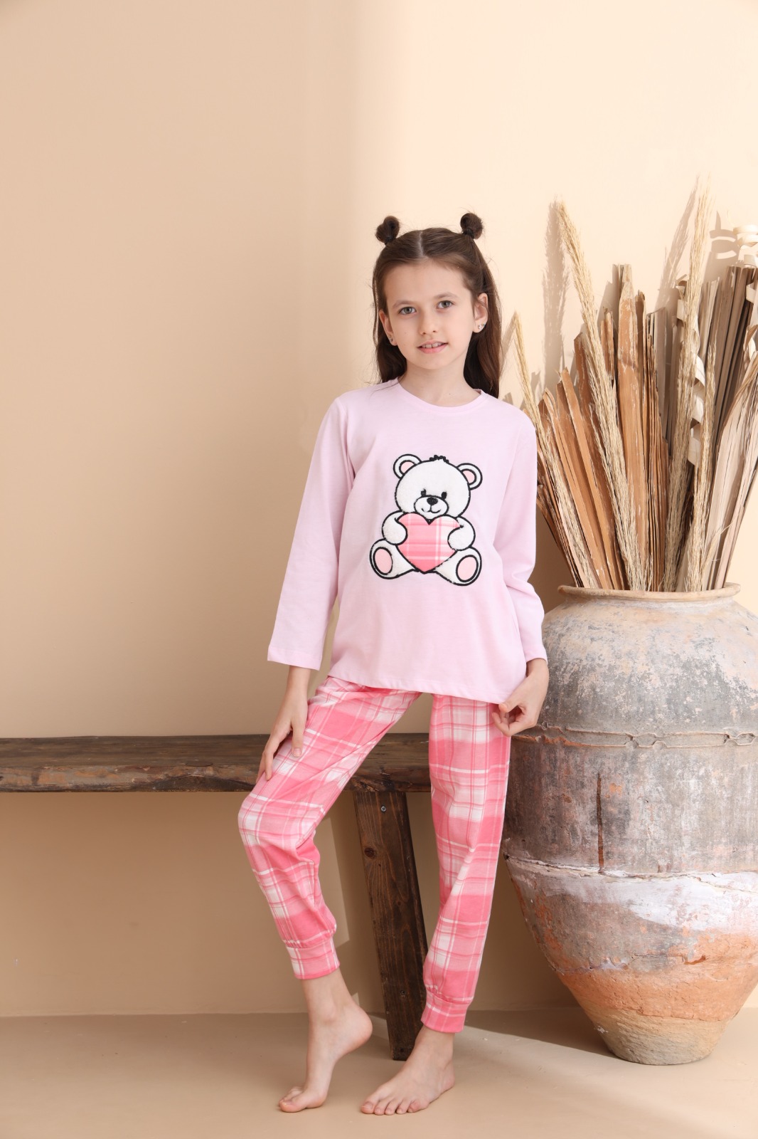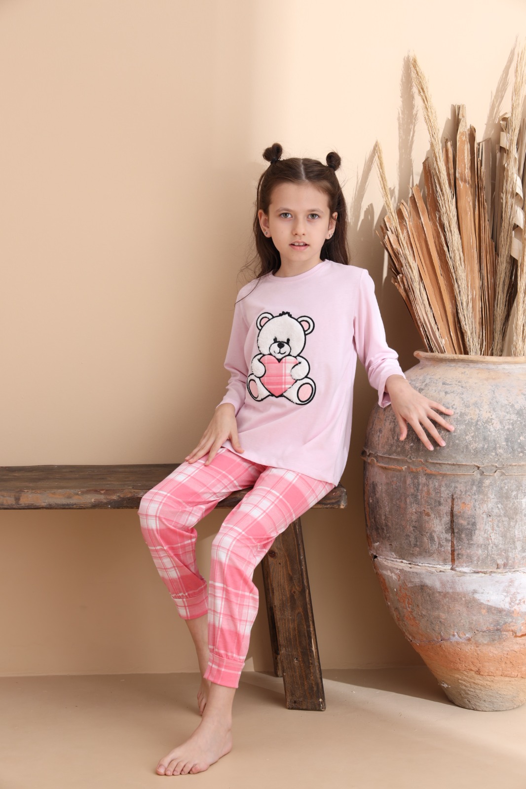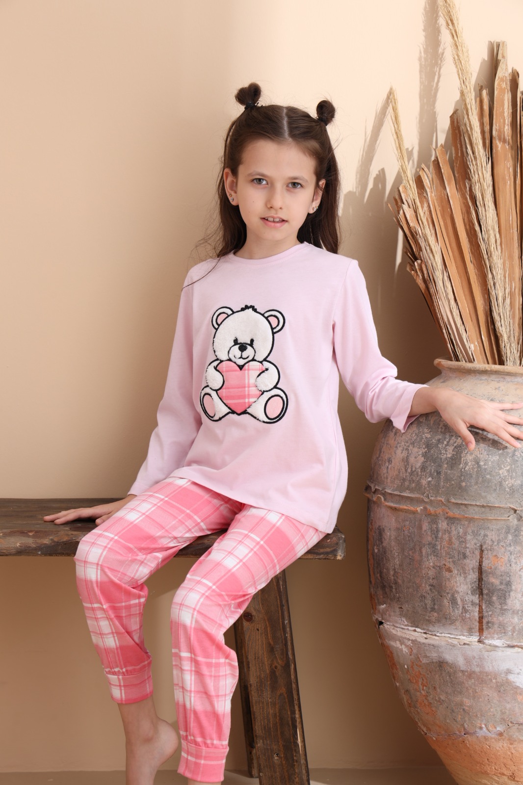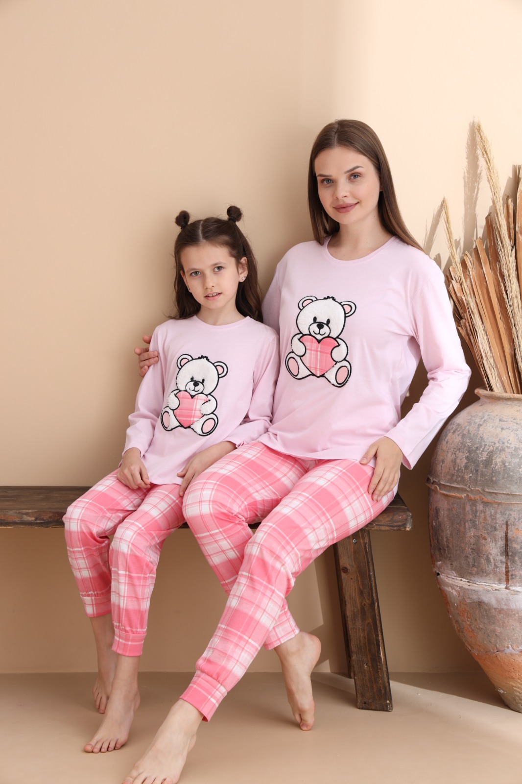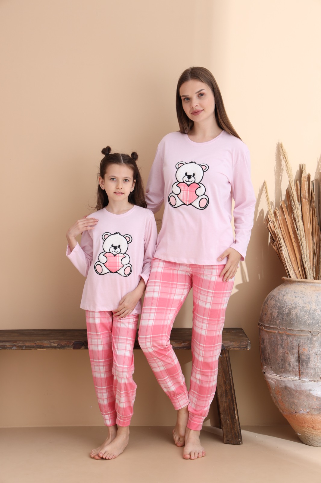 Уютна детска пижама от колекцията „Мама и аз“ .Тези модели са създадени за специални моменти у дома – когато майка и дъщеря могат да се насладят на уют, мекота и стил заедно. Състояща се от горна част с дълъг ръкав и сладък 3D принт на мече, комбинирана с дълъг панталон. Панталона е с маншет.