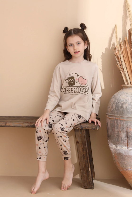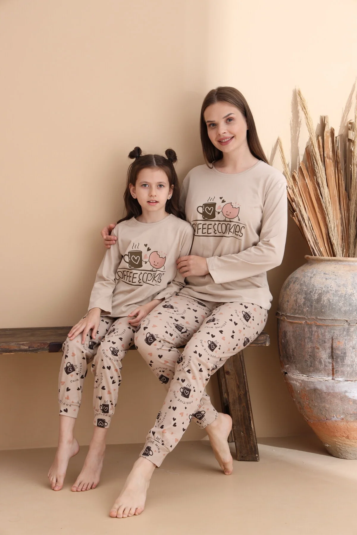 Уютна детска пижама от колекцията „Мама и аз“ .Тези модели са създадени за специални моменти у дома – когато майка и дъщеря могат да се насладят на уют, мекота и стил заедно. Състояща се от горна част с дълъг ръкав и принт, комбинирана с дълъг панталон с маншет.