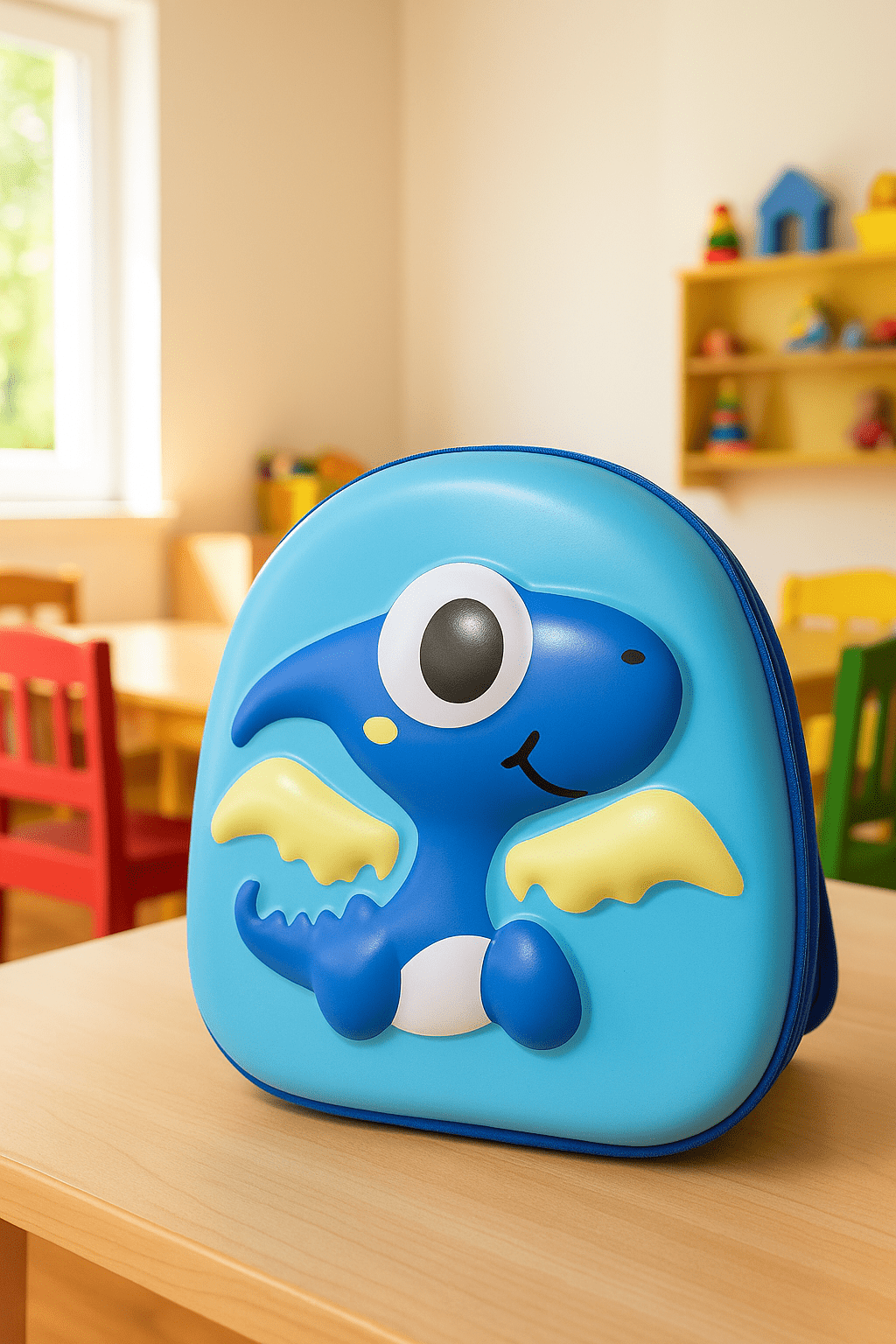 Детска раница с твърда предна част. Идеална за детска градина, ясли или разходки. Цветният 3D дизайн с драконче прави раницата атрактивна. Раницата разполага с отделение с цип за удобно подреждане на принадлежности и регулируеми меки презрамки за максимален комфорт. Твърдата предна част предпазва съдържанието от удари и смачкване. Подходяща за момчета.