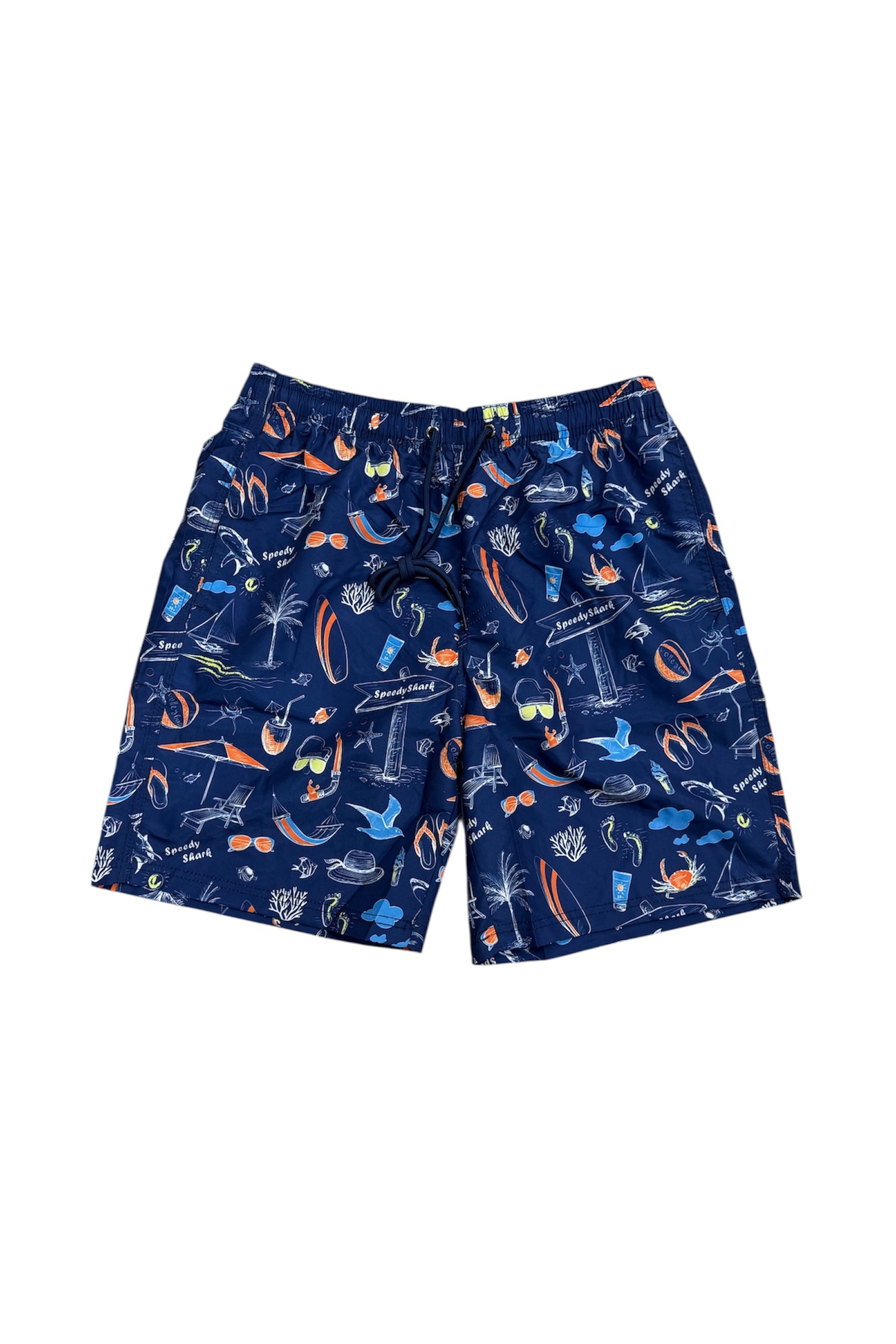 Детски бански шорти от лека и бързосъхнеща материя, с вътрешен мрежест бандаж и ластичен колан на талията с връзки. Моделът е с два странични и един заден джоб.