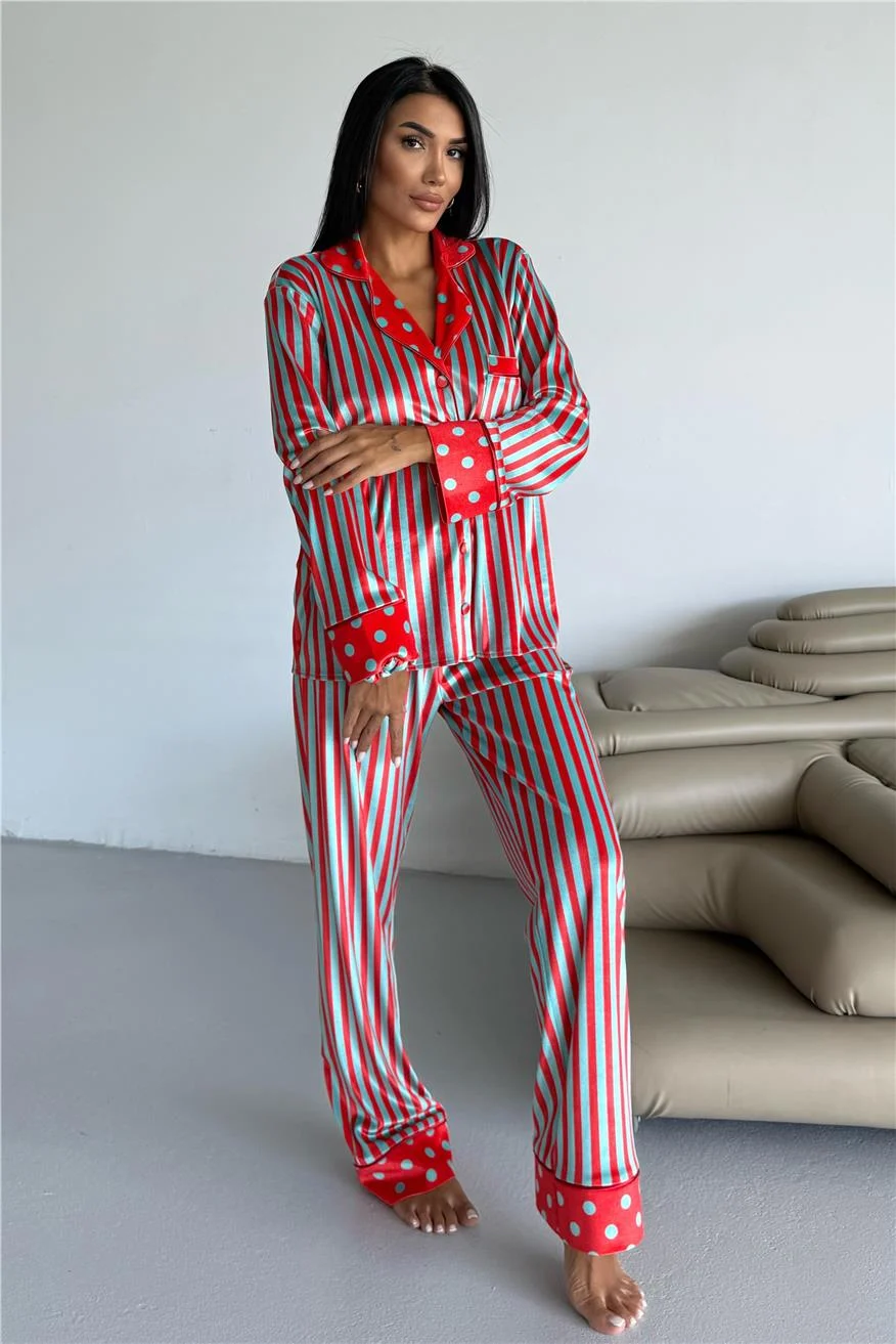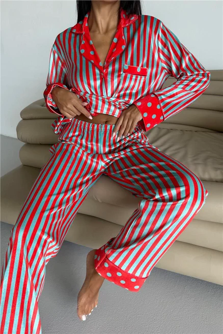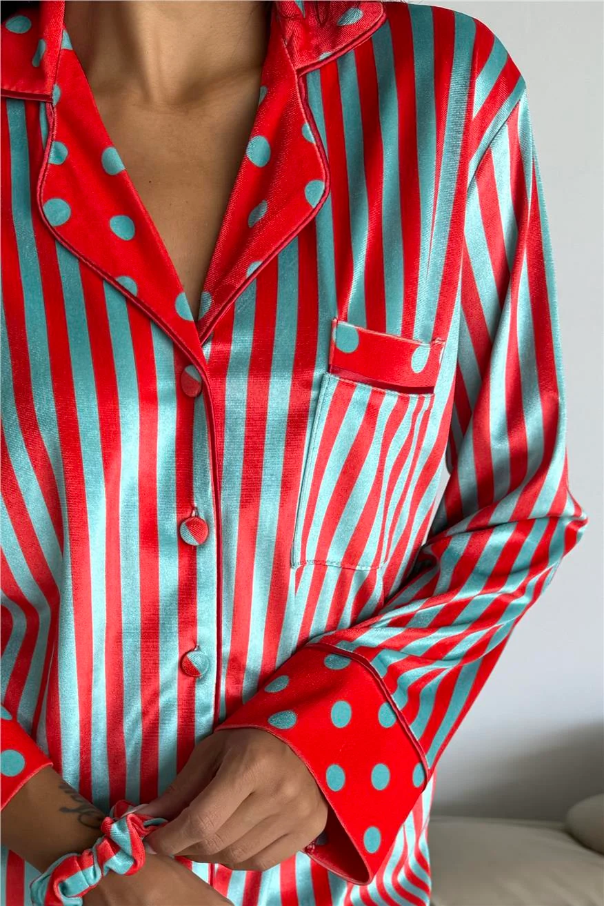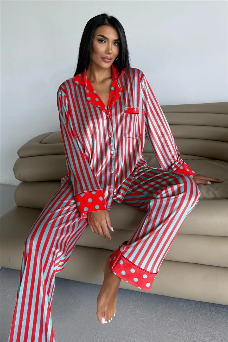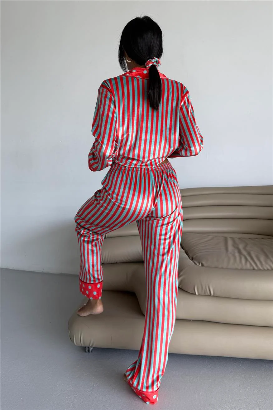 Дамска кадифена пижама в червени и ментово зелени райета. Мека, топла и стилна – идеална за уютни зимни вечери у дома.