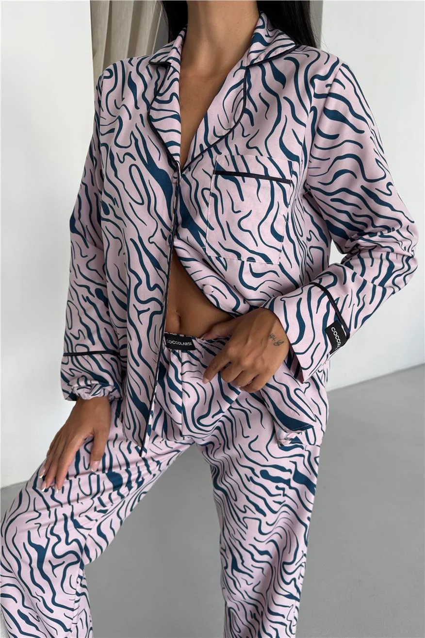 Елегантна дамска пижама + подарък – скрънчи за коса. Изработена от комбинация от полиестер и вискоза – матова и мека материя. Горнището е с дълъг ръкав, копчета по цялата дължина и джобче отпред. Долнището е дълъг панталон с еластичен колан.