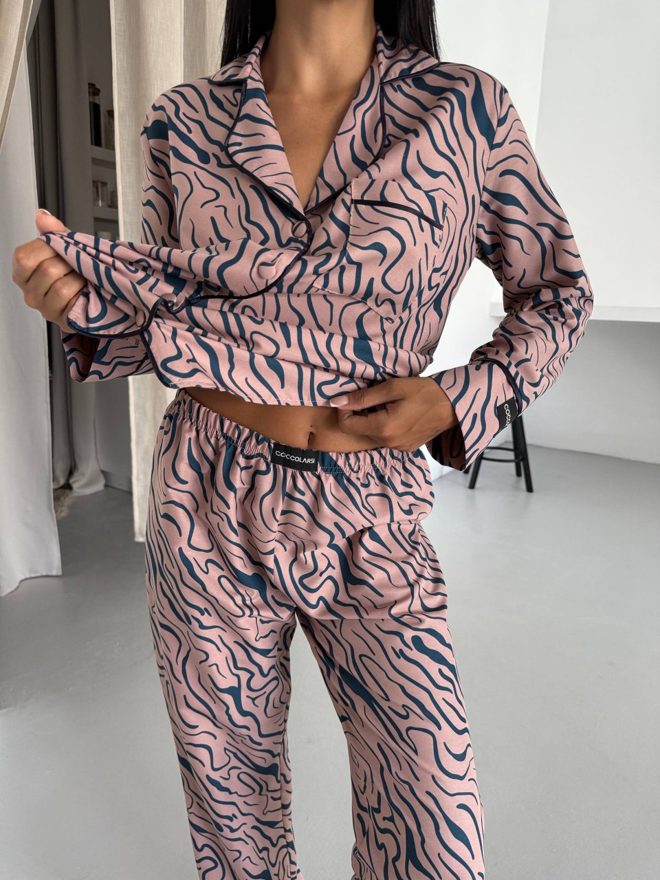 Елегантна дамска пижама + подарък – скрънчи за коса. Изработена от комбинация от полиестер и вискоза – матова и мека материя. Горнището е с дълъг ръкав, копчета по цялата дължина и джобче отпред. Долнището е дълъг панталон с еластичен колан.