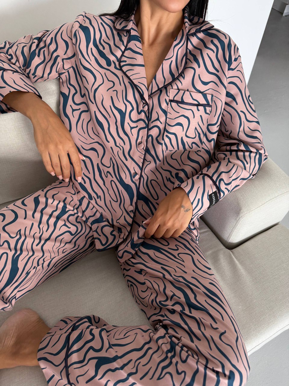 Пижама от сатинирана вискоза – практичен избор с матиран ефект. Устойчива, лесна за поддръжка и по-малко се мачка. Вискозата придава мекота и дишаемост, докато полиестерът осигурява издръжливост и форма.