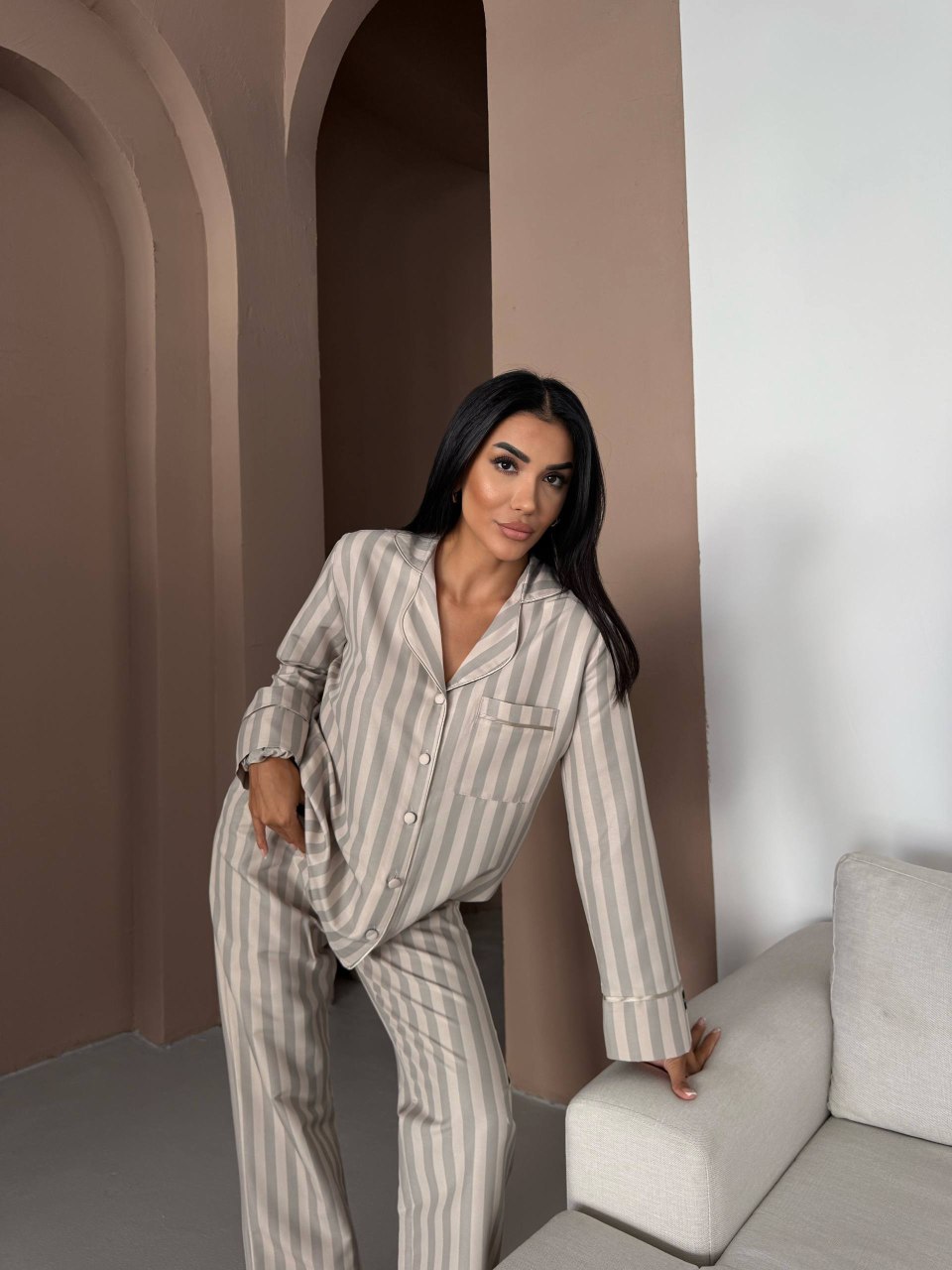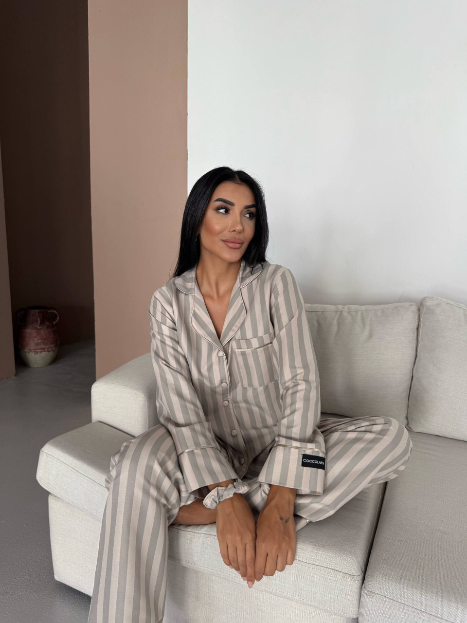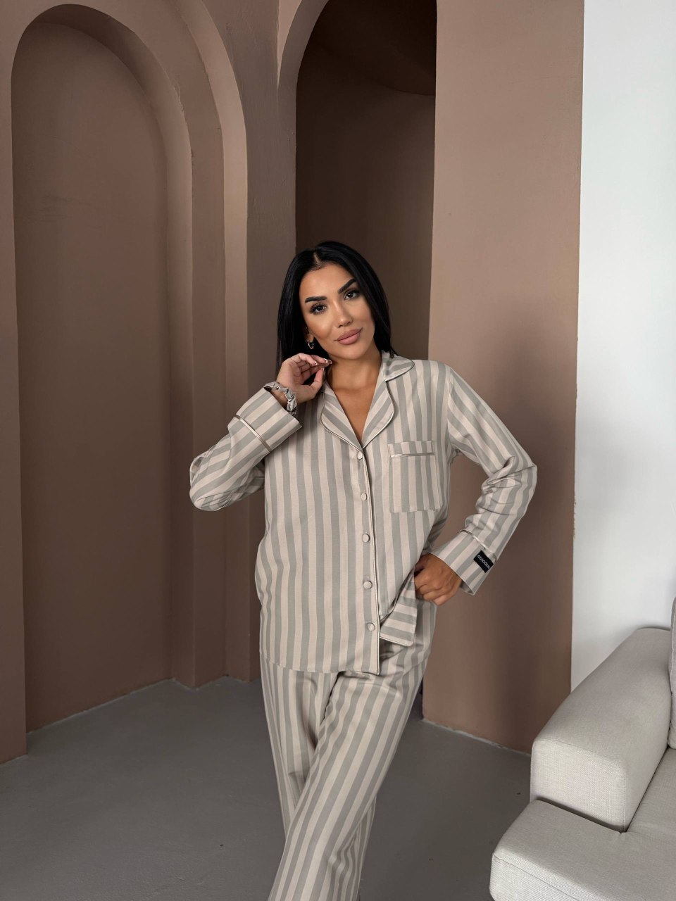 Елегантна дамска пижама + подарък – скрънчи за коса. Изработена от комбинация от полиестер и вискоза – матова и мека материя. Горнището е с дълъг ръкав, копчета по цялата дължина и джобче отпред. Долнището е дълъг панталон с еластичен колан.