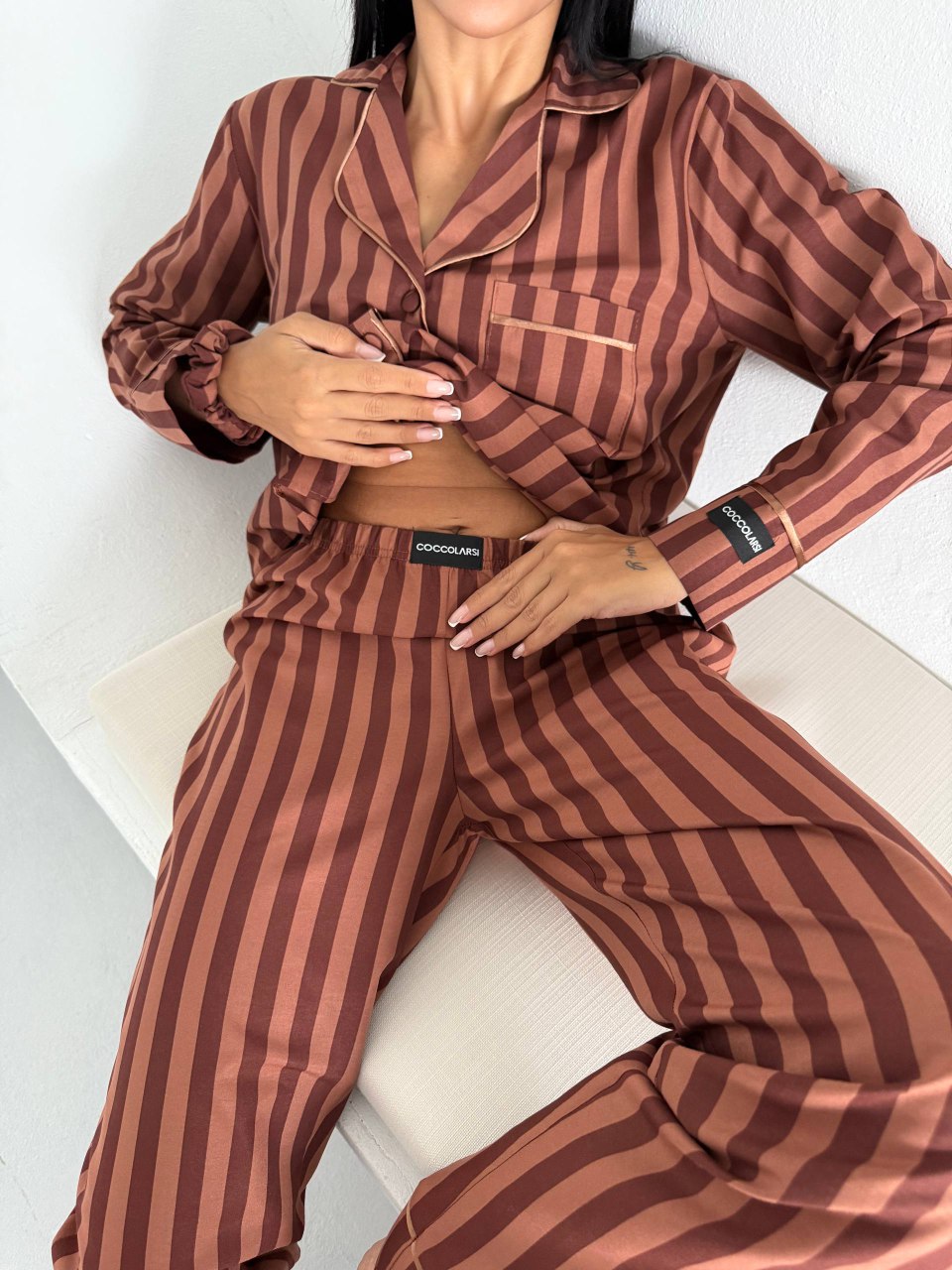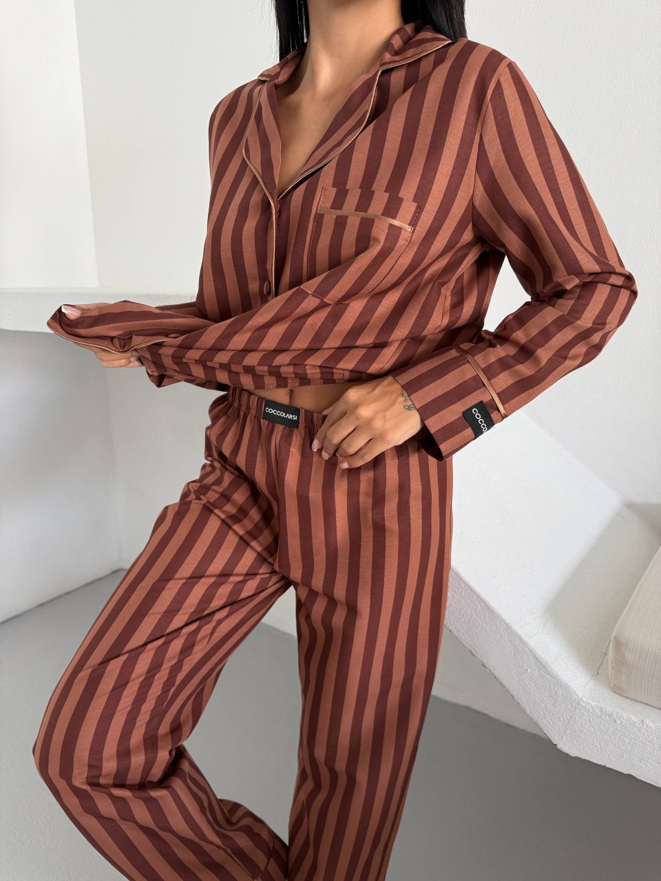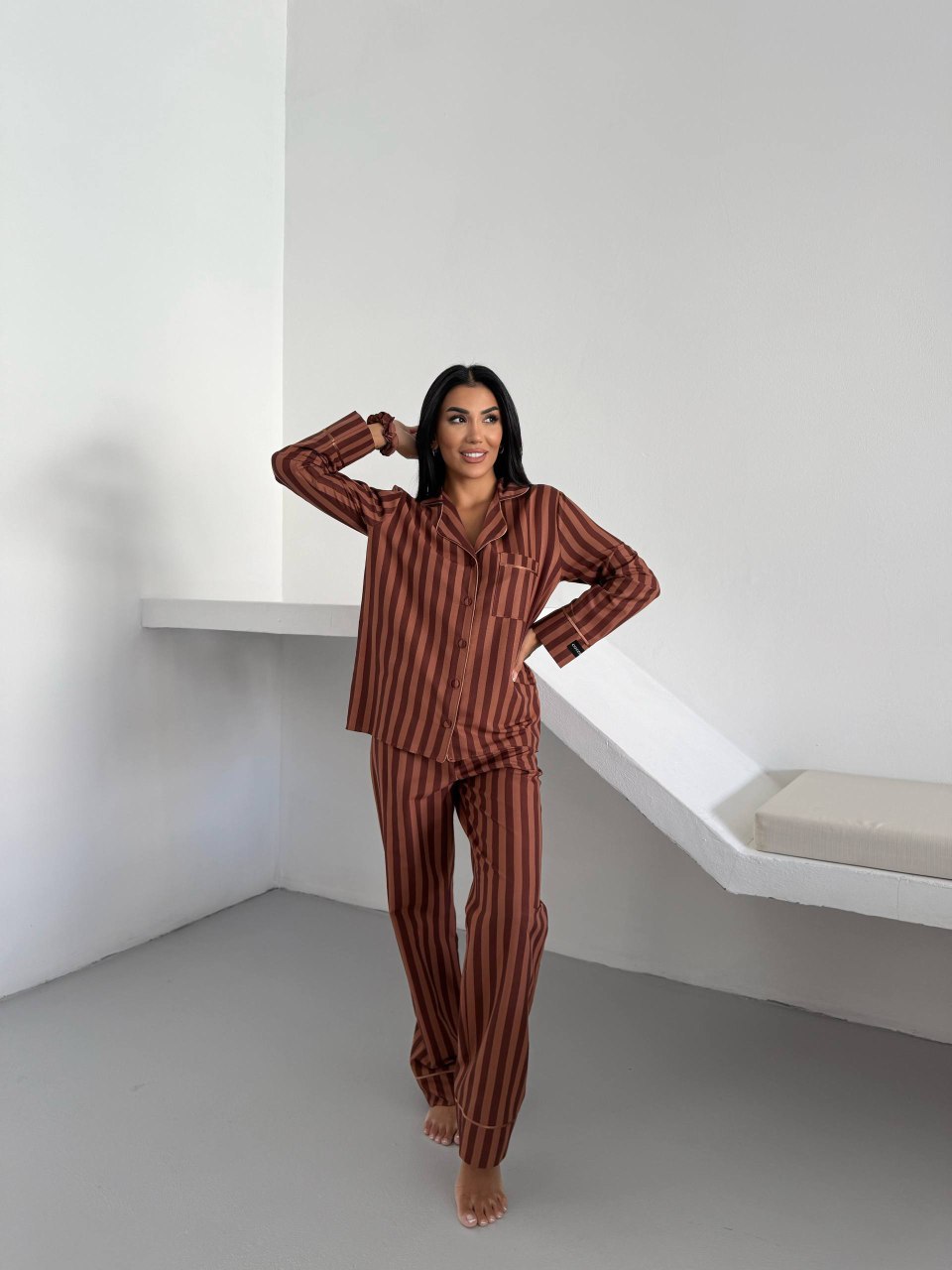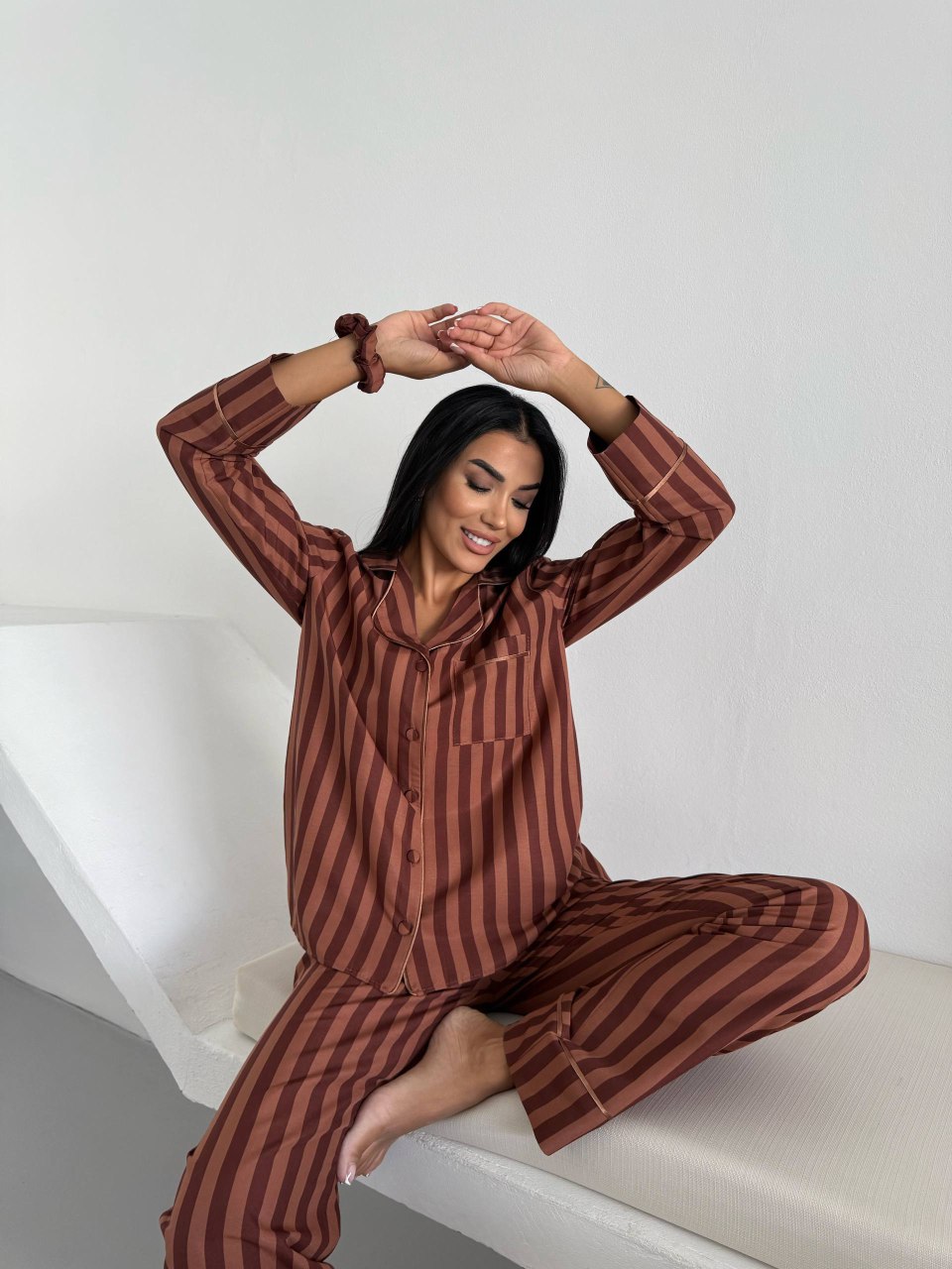 Елегантна дамска пижама + подарък – скрънчи за коса. Изработена от комбинация от полиестер и вискоза – матова и мека материя. Горнището е с дълъг ръкав, копчета по цялата дължина и джобче отпред. Долнището е дълъг панталон с еластичен колан.