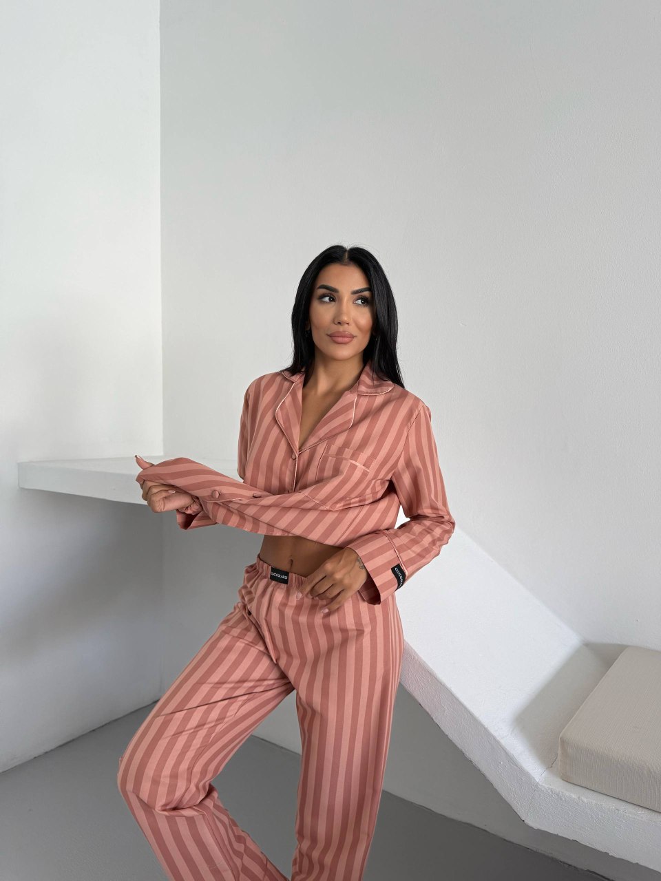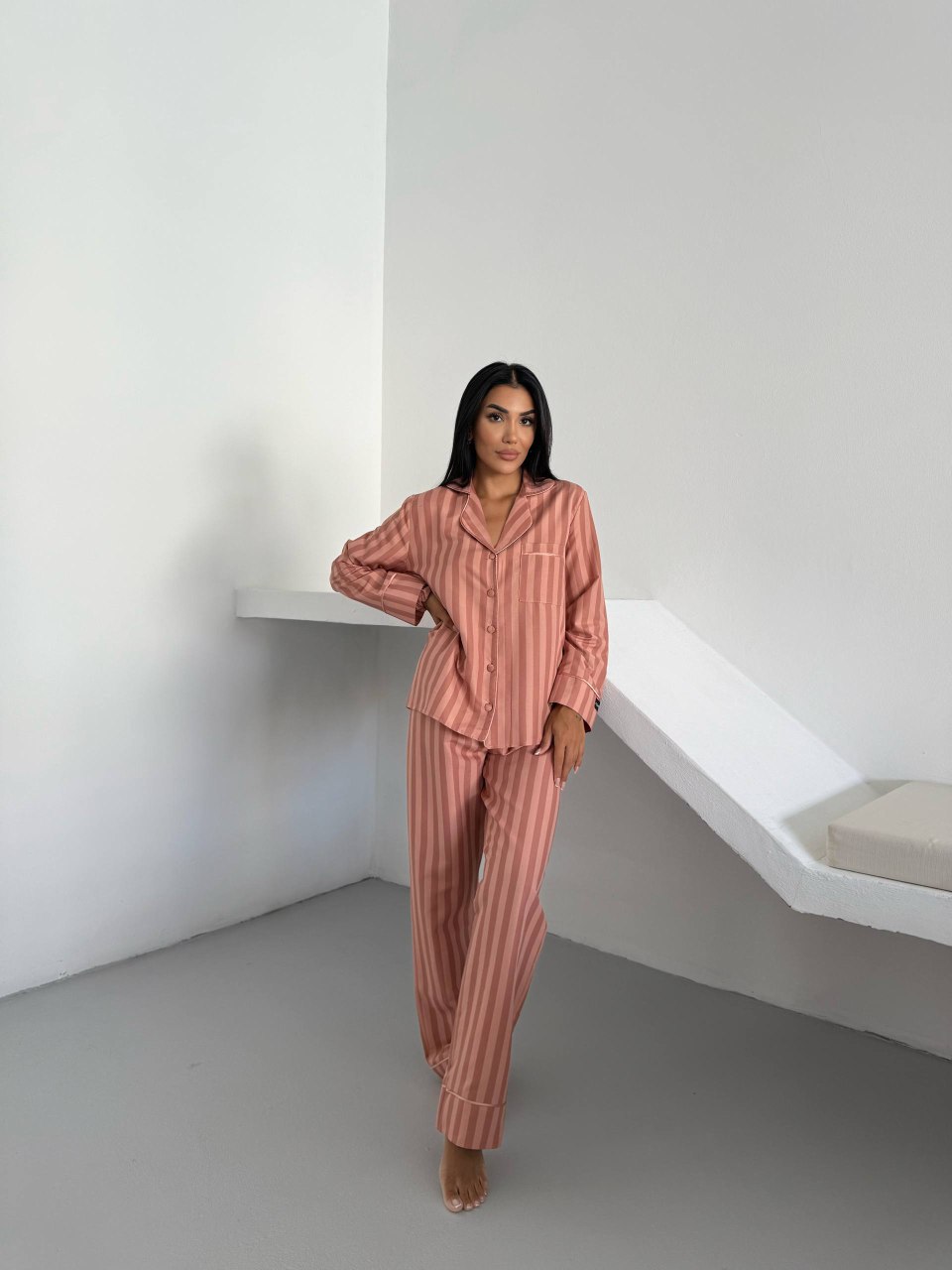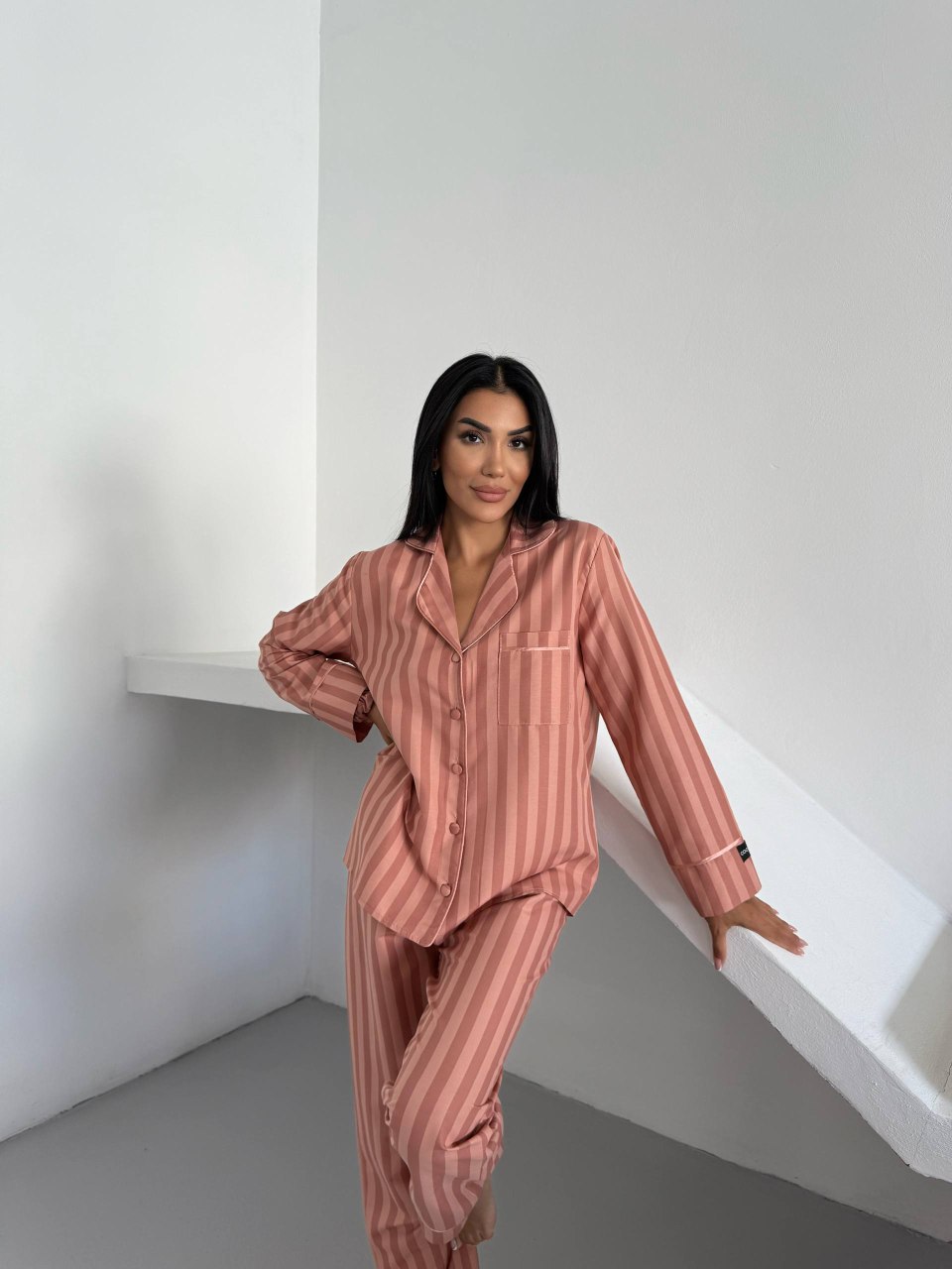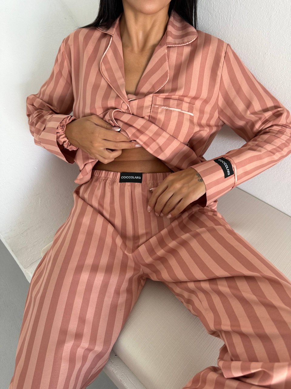 Елегантна дамска пижама + подарък – скрънчи за коса. Изработена от комбинация от полиестер и вискоза – матова и мека материя. Горнището е с дълъг ръкав, копчета по цялата дължина и джобче отпред. Долнището е дълъг панталон с еластичен колан.