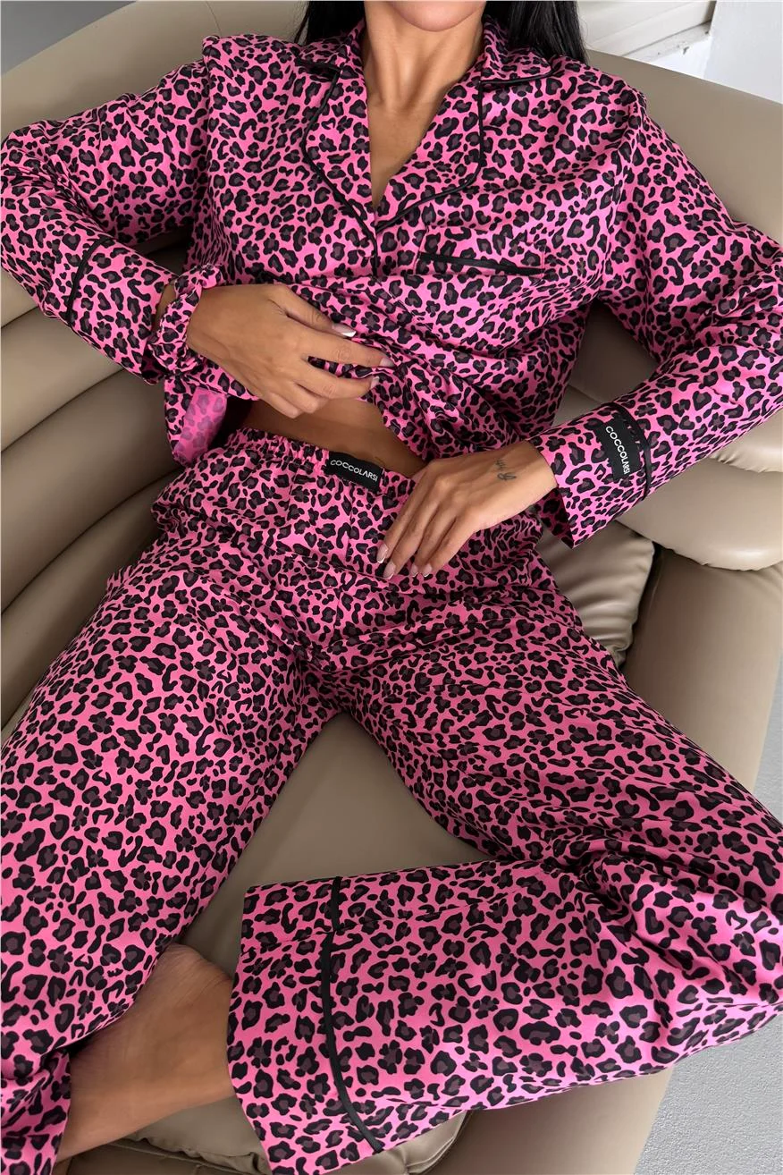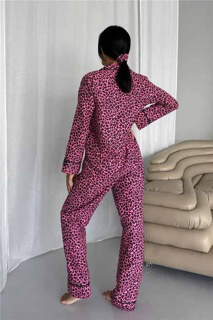 Елегантна дамска пижама + подарък – скрънчи за коса. Изработена от комбинация от полиестер и вискоза – матова и мека материя. Горнището е с дълъг ръкав, копчета по цялата дължина и джобче отпред. Долнището е дълъг панталон с еластичен колан.