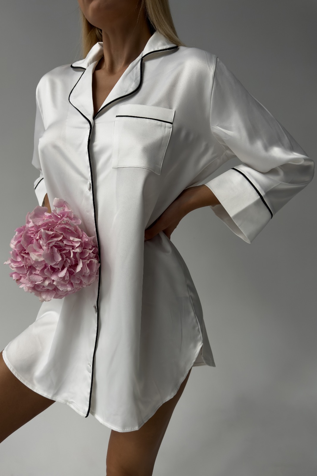 Открийте елегантността с тази дамска сатенена нощница в бяло, украсена с фини черни кантове – с подарък скрънчи. Изработена от висококачествен сатен, тя е мека, лека и изключително приятна на допир. Перфектна както за комфортен сън, така и за романтични вечери у дома.