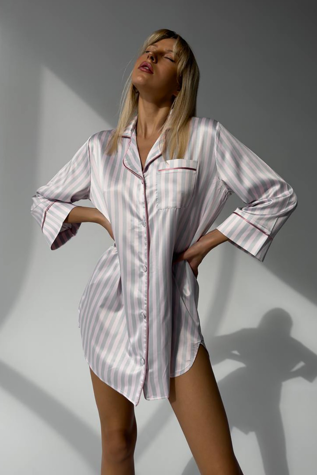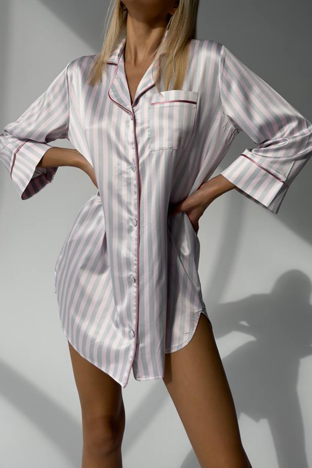 Сатенена нощница с вертикални розови и сиви райета – лукс, удобство и стил. Идеална за сън, релакс или подарък.