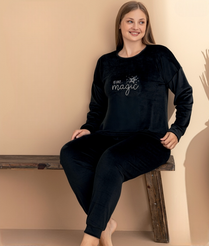 Подарете си истински комфорт и стил с кадифената макси пижама. Изработена е от висококачествено меко кадифе, което осигурява еластичност, свобода на движение и приятно усещане върху кожата. Моделът е специално създаден за дами, които ценят комфорта, но не искат да правят компромис със стила си.
