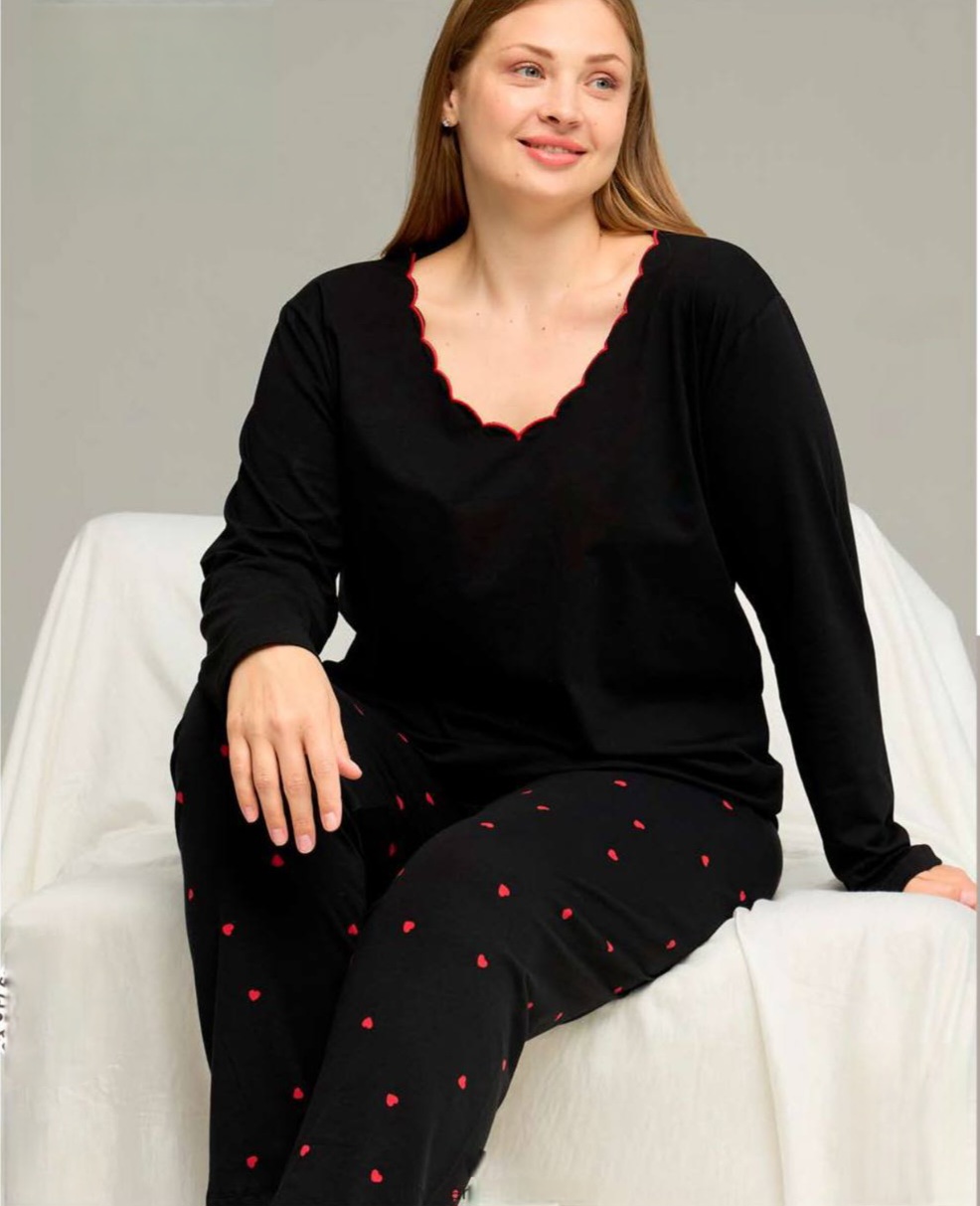 Създадена за комфорт и самочувствие, тази дамска пижама плюс размер е изработена от висококачествена материя – 95% памук и 5% ликра. Меката и дишаща тъкан осигурява свобода на движение и удобство, а еластичността подчертава женствените форми, без да стяга.