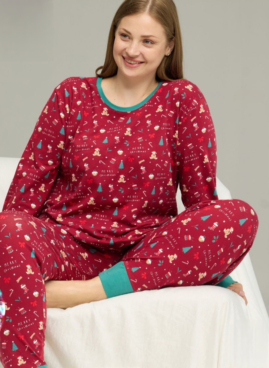 Създадена за комфорт и самочувствие, тази дамска пижама плюс размер е изработена от висококачествена материя – 95% памук и 5% ликра. Меката и дишаща тъкан осигурява свобода на движение и удобство, а еластичността подчертава женствените форми, без да стяга.