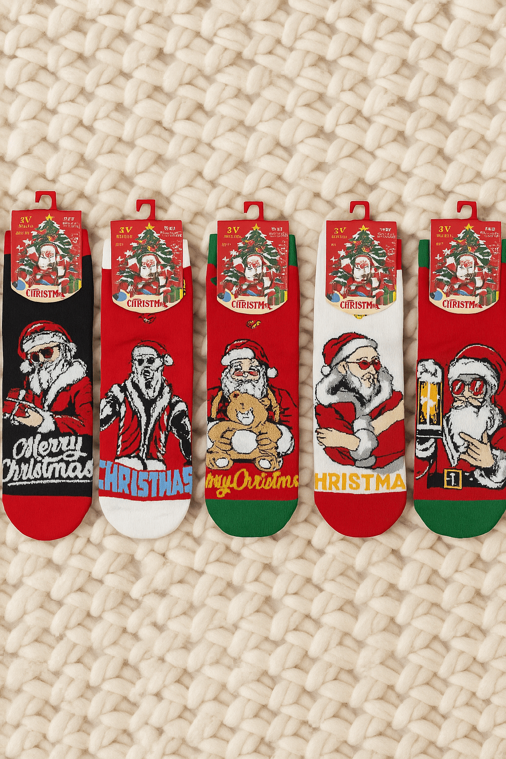 Коледни мъжки чорапи – комплект от 5 чифта с празнично настроение 🎄 Посрещнете празниците със стил и уют с комплекта коледни чорапи. Всеки чифт е с уникален коледен дизайн и весели празнични мотиви, които ще внесат усмивка и топлина през зимата.