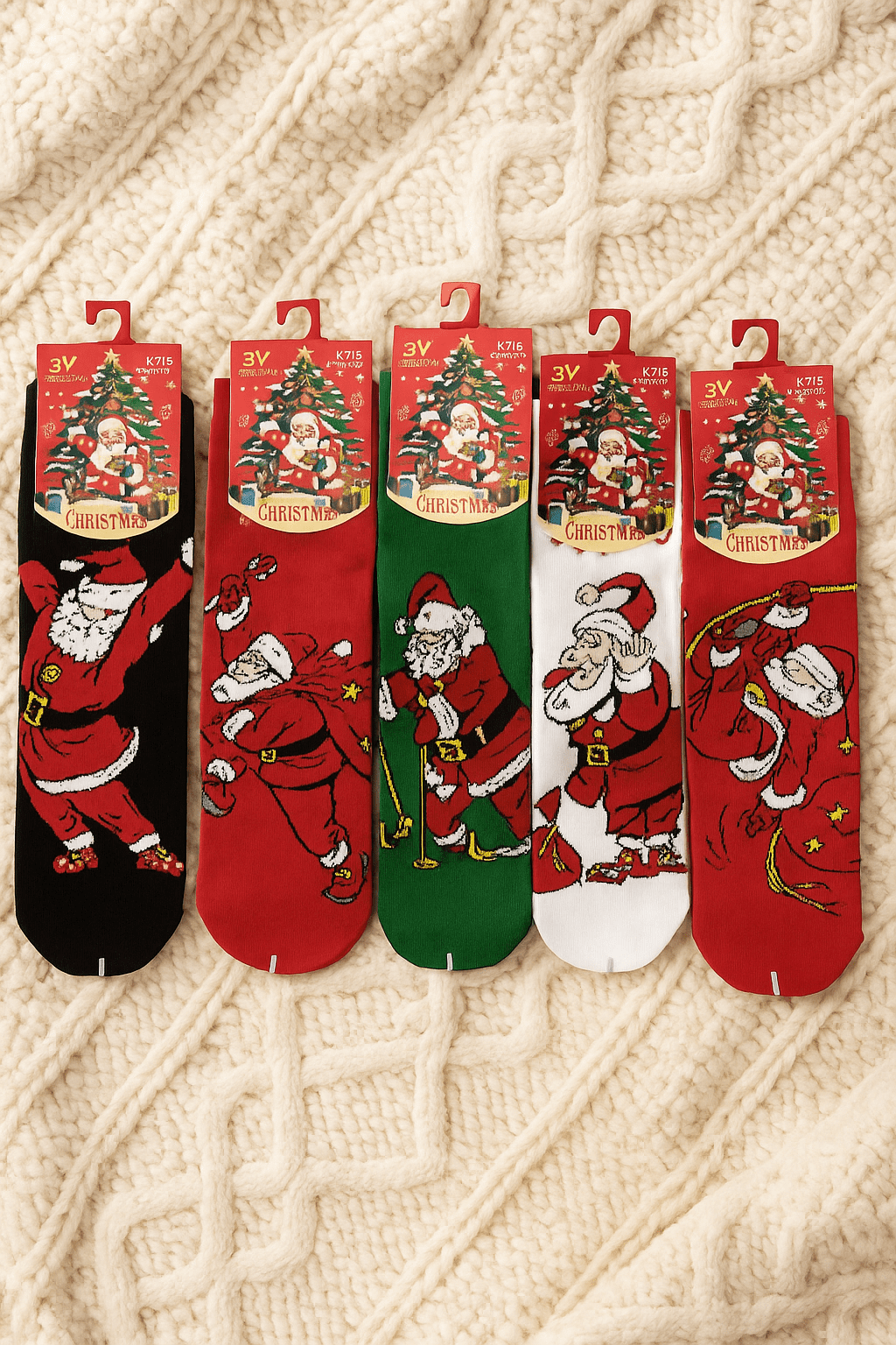 Коледни мъжки чорапи – комплект от 5 чифта с празнично настроение 🎄 Посрещнете празниците със стил и уют с комплекта коледни чорапи. Всеки чифт е с уникален коледен дизайн и весели празнични мотиви, които ще внесат усмивка и топлина през зимата.