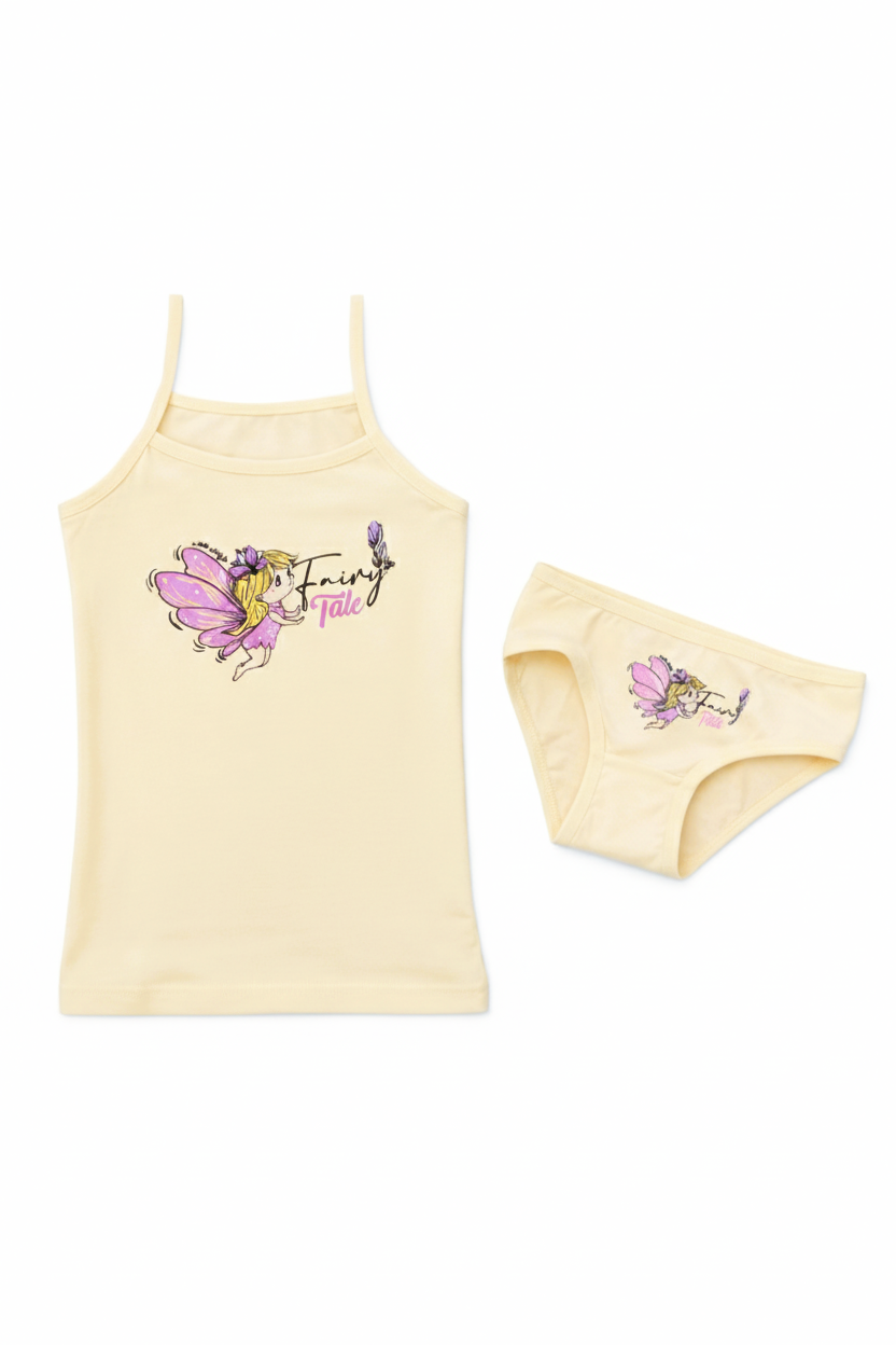 Очарователен детски комплект, изработен от мека и дишаща памучна материя, идеален за ежедневието, сън или топлите летни дни. Комплектът включва потник и бикини, съчетаващи комфорт, качество и нежна визия. Потникът е със тънки презрамки и удобна кройка, която не ограничава движенията, а бикините са с еластична талия за максимално удобство. Декорирани със сладка щампа.