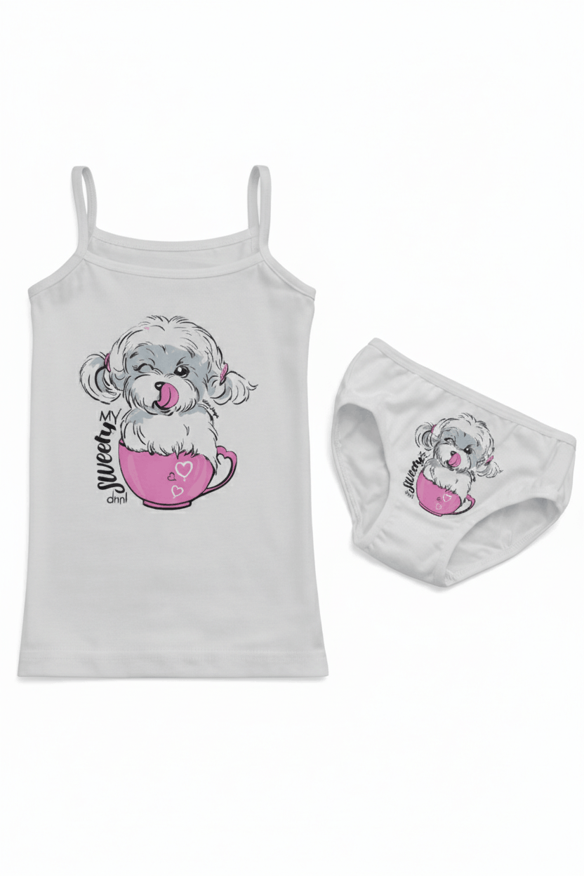 Очарователен детски комплект, изработен от мека и дишаща памучна материя, идеален за ежедневието, сън или топлите летни дни. Комплектът включва потник и бикини, съчетаващи комфорт, качество и нежна визия. Потникът е със тънки презрамки и удобна кройка, която не ограничава движенията, а бикините са с еластична талия за максимално удобство. Декорирани със сладка щампа.