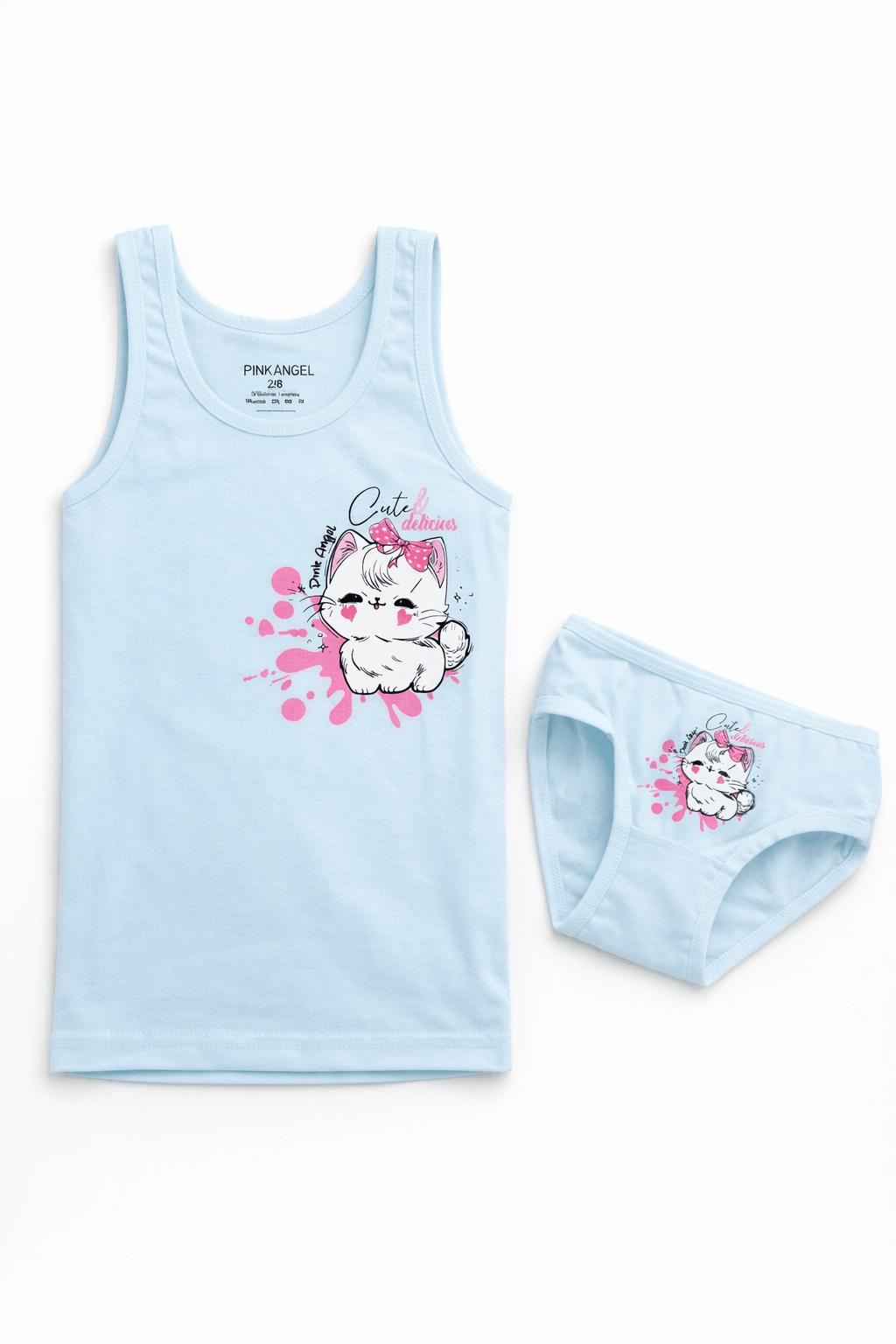 Очарователен детски комплект, изработен от мека и дишаща памучна материя, идеален за ежедневието, сън или топлите летни дни. Комплектът включва потник и бикини, съчетаващи комфорт, качество и нежна визия. Потникът е със широки презрамки и удобна кройка, която не ограничава движенията, а бикините са с еластична талия за максимално удобство. Декорирани с сладка щампа.
