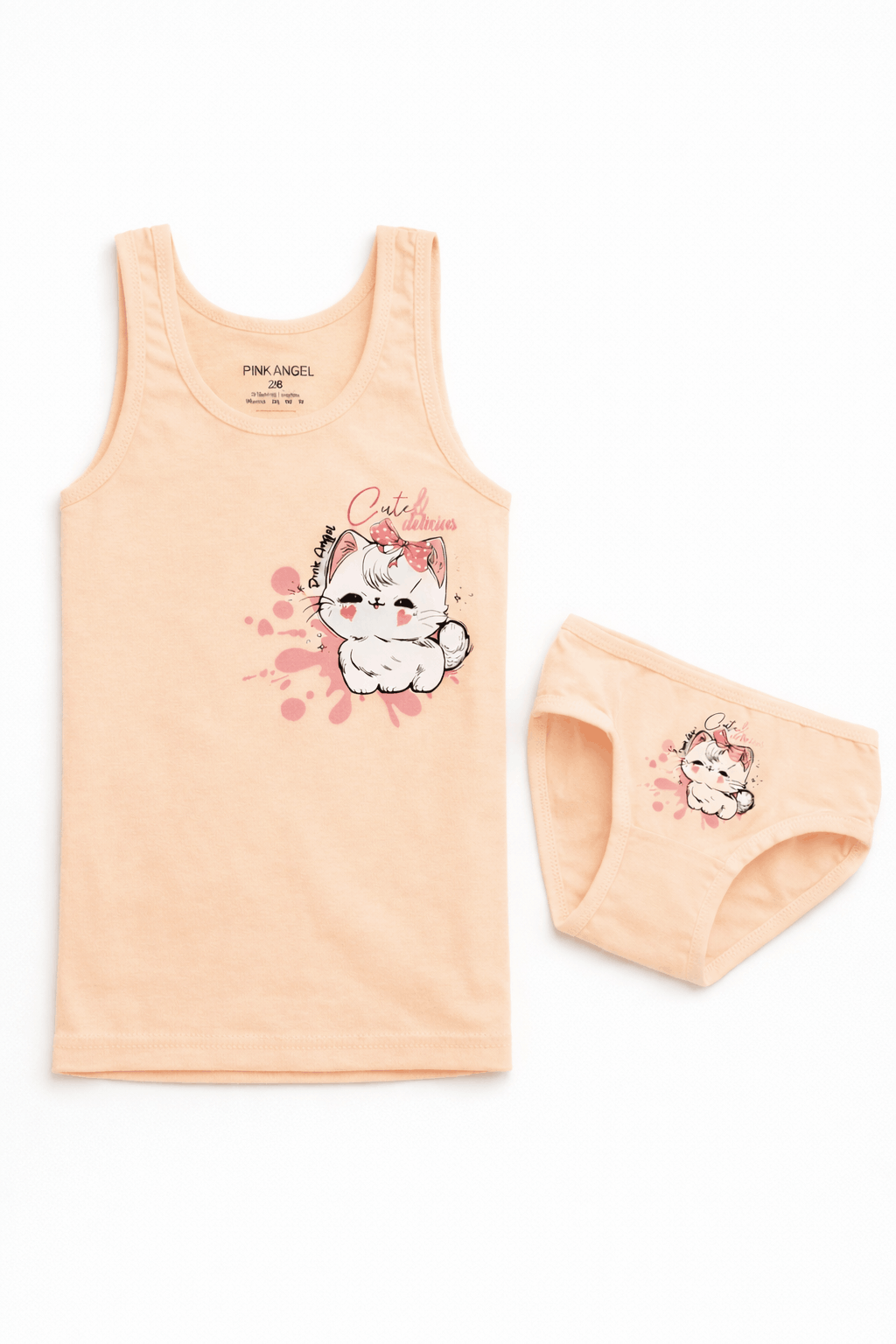 Очарователен детски комплект, изработен от мека и дишаща памучна материя, идеален за ежедневието, сън или топлите летни дни. Комплектът включва потник и бикини, съчетаващи комфорт, качество и нежна визия. Потникът е със широки презрамки и удобна кройка, която не ограничава движенията, а бикините са с еластична талия за максимално удобство. Декорирани с сладка щампа.