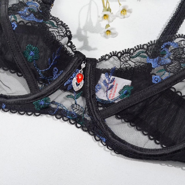 Еротичен комплект дамско бельо – сутиен, бикина, жартиерен колан и аксесоари. Моделът съчетава прозрачна мрежеста материя с изящна флорална бродерия и деликатни декоративни елементи, които създават изтънчена и съблазнителна визия. Комплектът включва: Сутиен с меки чашки и банели, регулируеми презрамки. Жартиерен колан с регулируеми ленти. Прашки с регулираща се талия.