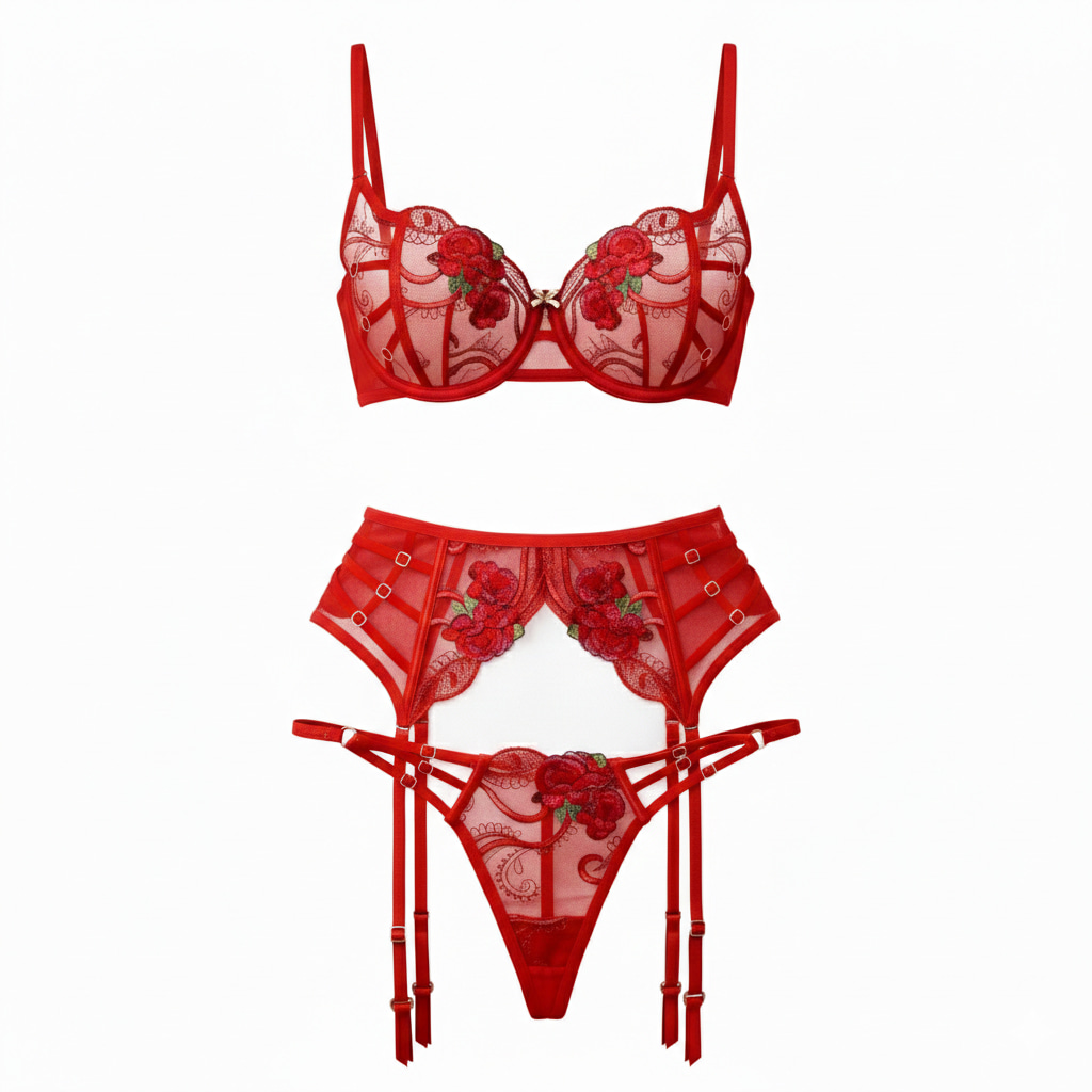 Разкрийте своята чувственост с този впечатляващ комплект дамско бельо, декориран с флорална бродерия. Комбинацията от прозрачна мрежеста материя и изразителни детайли създава изтънчена и съблазнителна визия. Комплектът включва: Сутиен с банели и меки чашки, с регулируеми презрамки. Елегантен жартиерен колан. Прашки с флорални акценти. Фините дантелени кантове и внимателно изработената бродерия придават луксозно излъчване, а регулируемите елементи осигуряват перфектно прилепване към тялото.