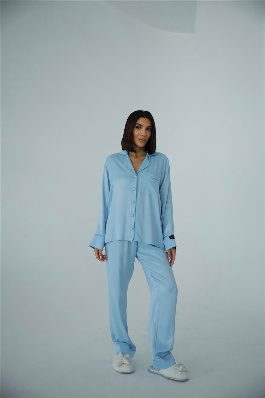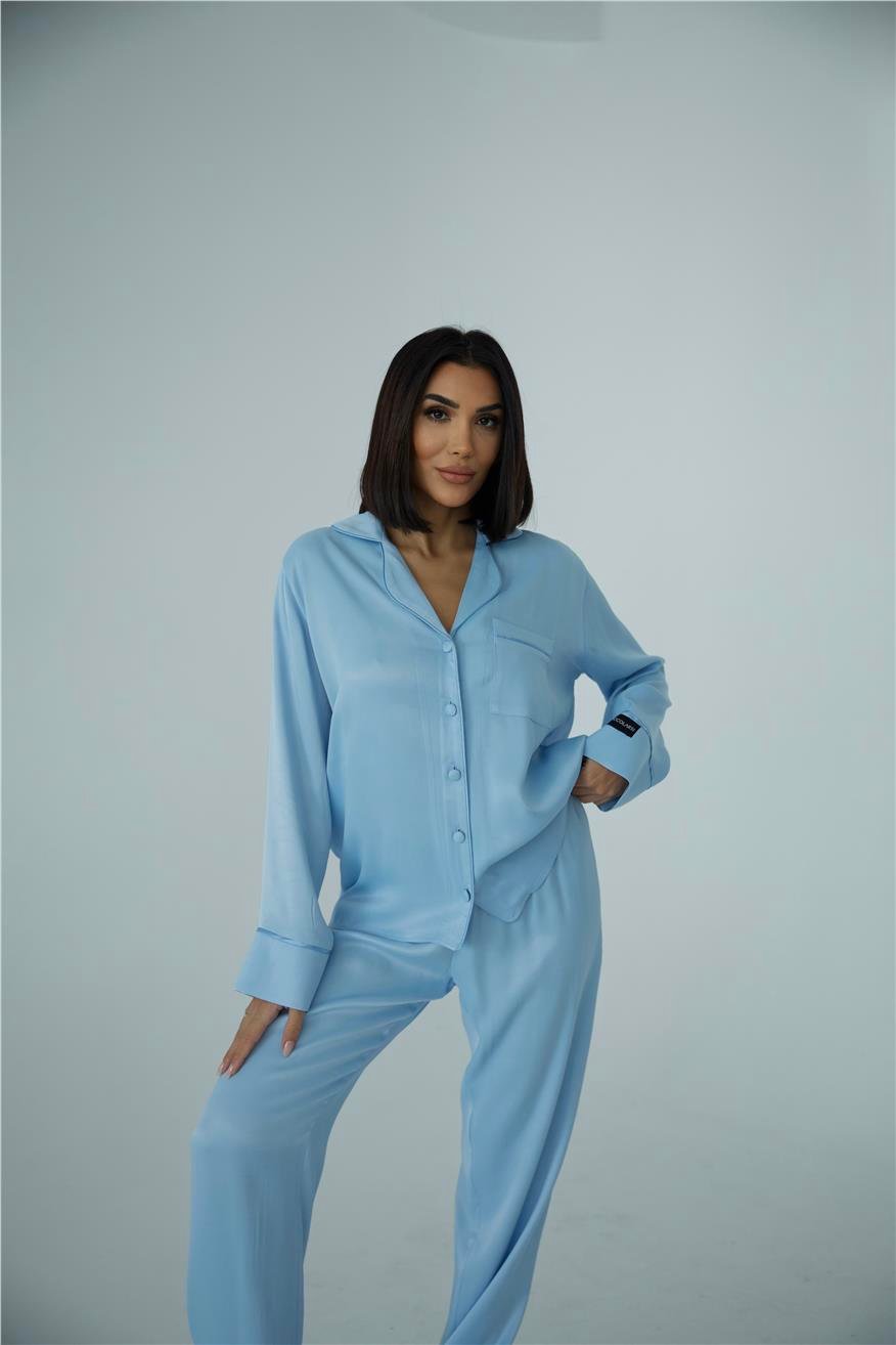 Елегантен сатенен комплект от две части. Горнище с дълъг ръкав, с копчета, яка и джоб. Долнището с дълъг прав широк крачол и ластик в талията. Към комплекта имате подарък скрънч в същият десен. Този сатенен сет е идеален избор както за домашен уют, така и за стилен подарък. Материята е мека, нежна към кожата и придава усещане за лукс.